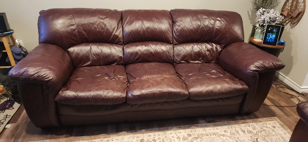 Comfortable brown leather sofa and loveseat set. Showing some signs of wear, particularly on the sofa seats. Sturdy construction for long-lasting use.