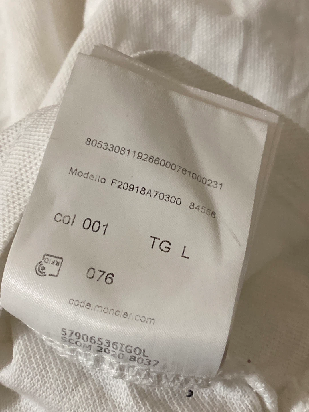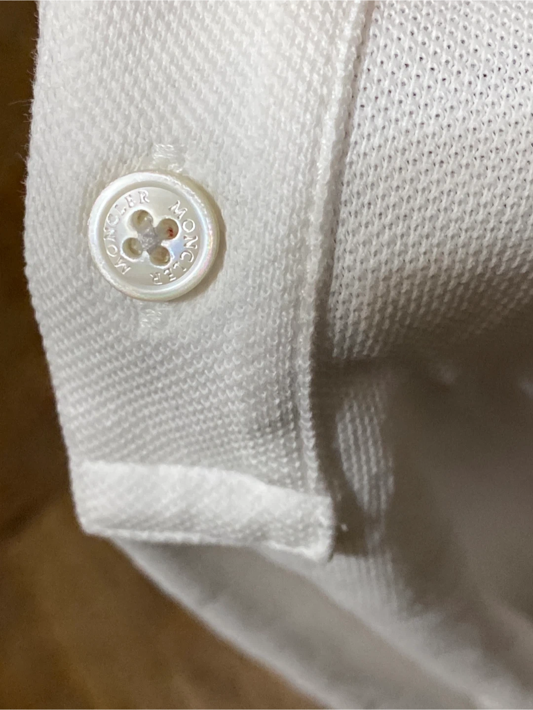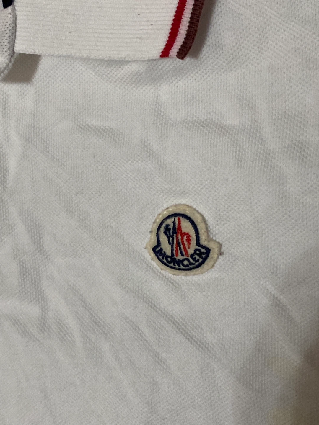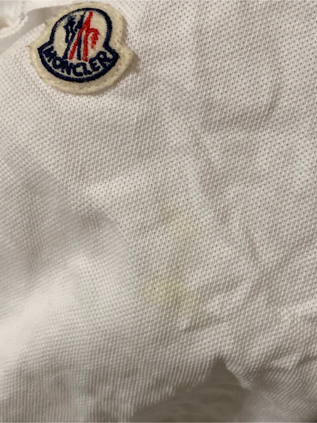 Classic white Moncler polo shirt with iconic logo detailing. Features striped collar and cuffs. Some minor yellow staining is present on the front, and a small pull near the hem. Ready for a new home!