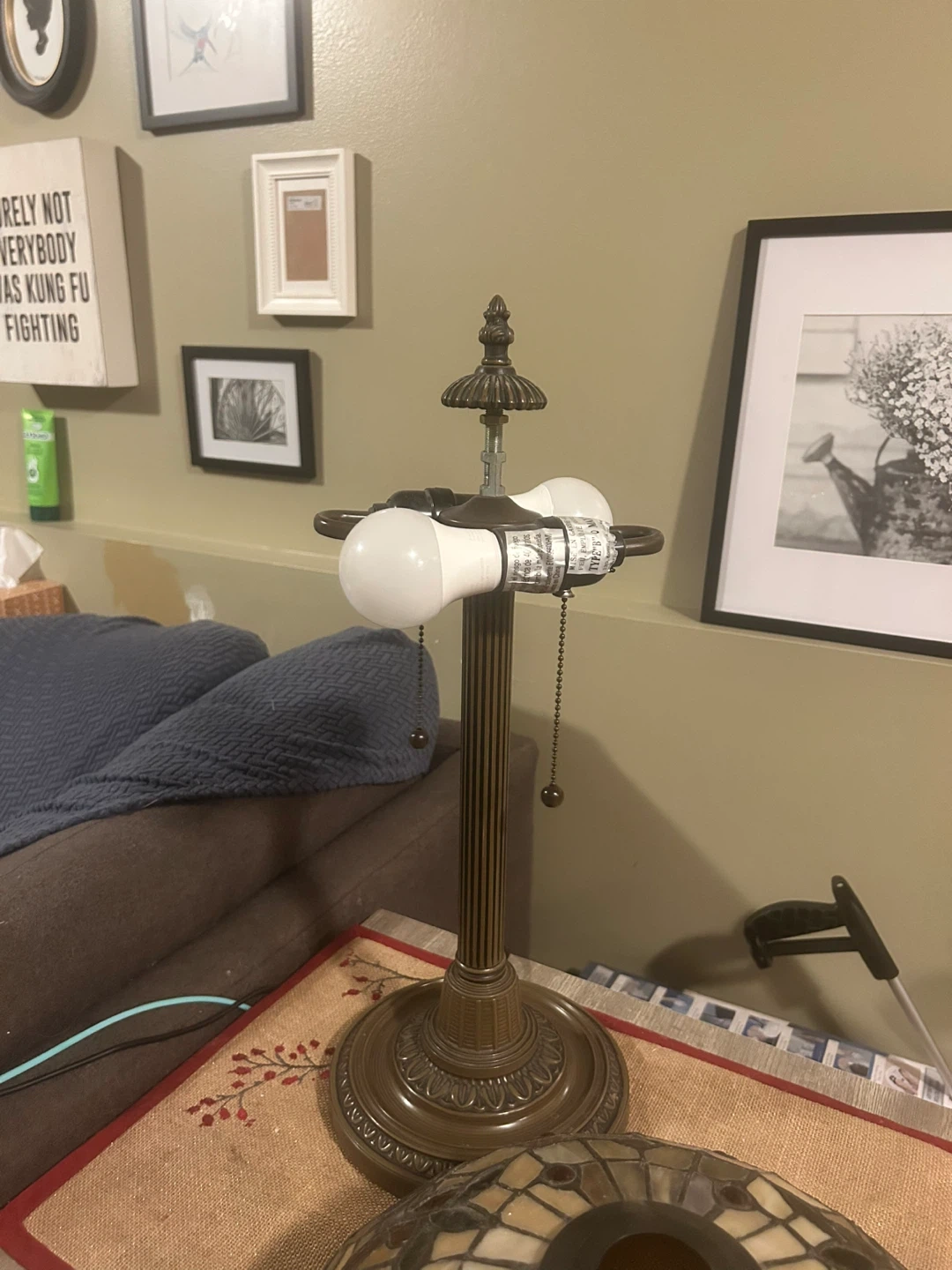 **missing the cap that secures the shade to the base. Despite this, it has been used daily. The shade rests easily and safely atop the base. Price reflects this missing piece.