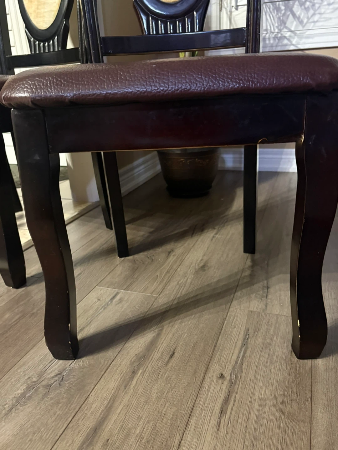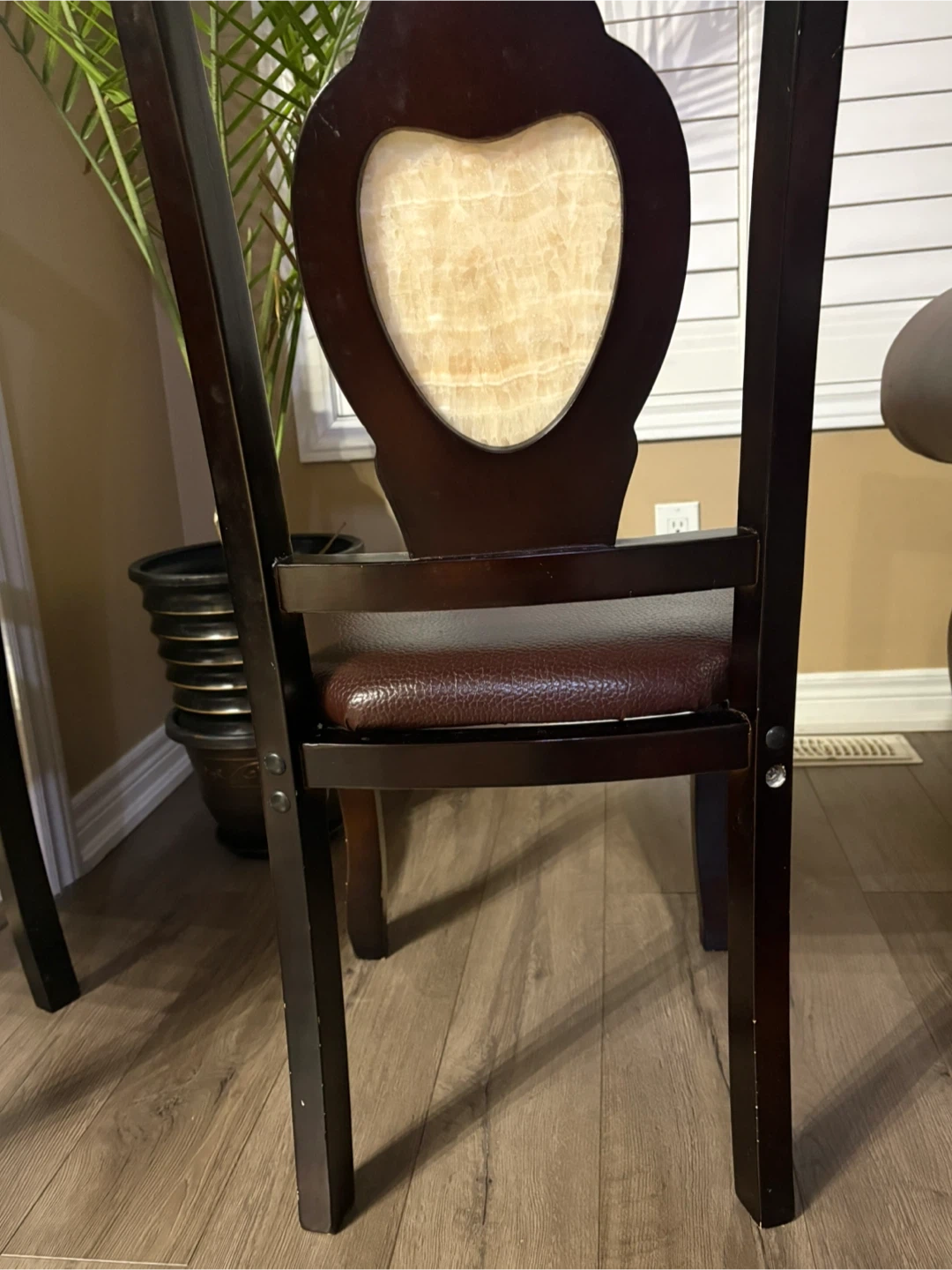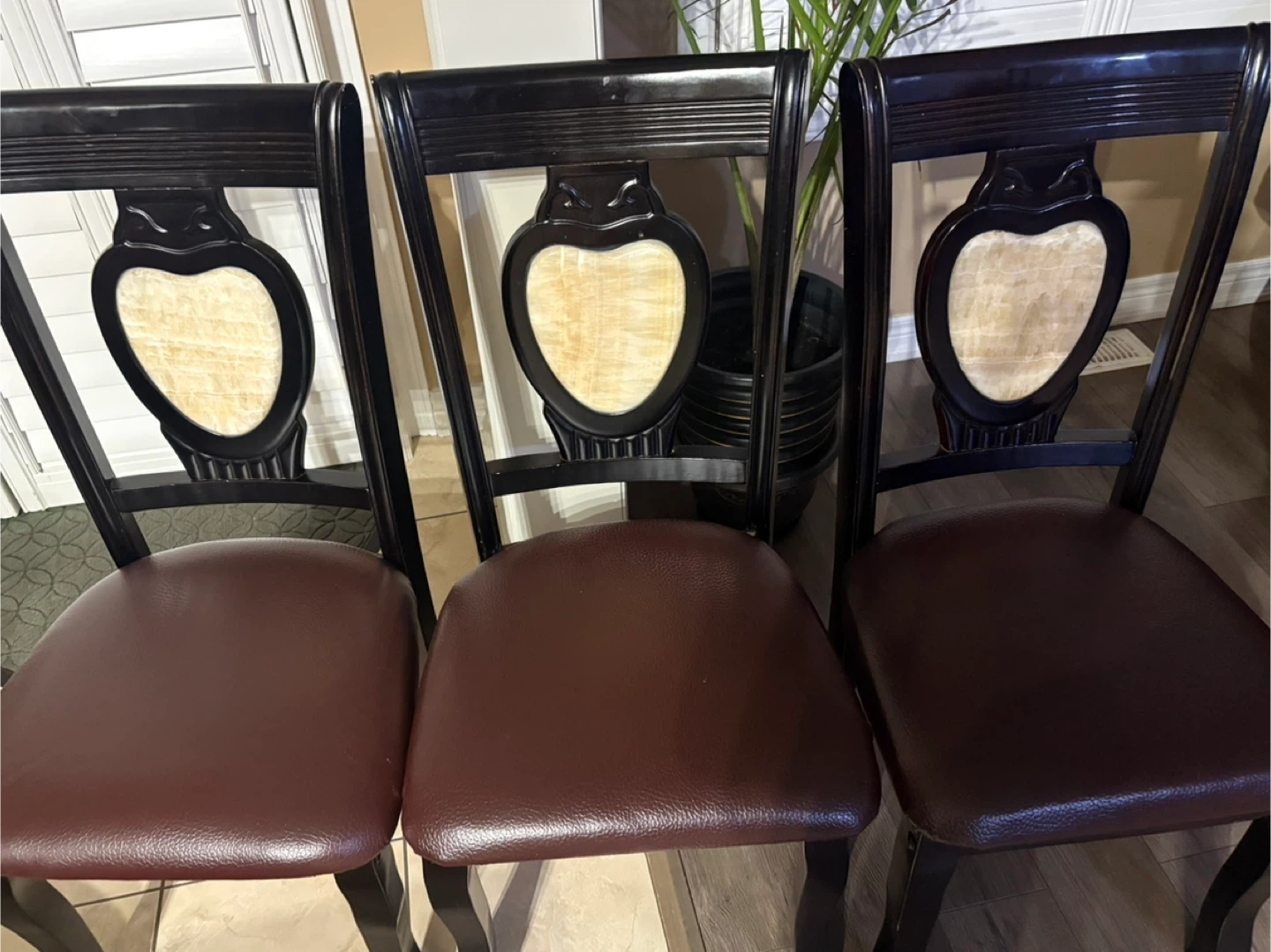 Set of three dark wood dining chairs with patterned light wood inlays on the backs. Each chair has a comfortable brown faux leather seat cushion. They're sturdy and in great shape!
