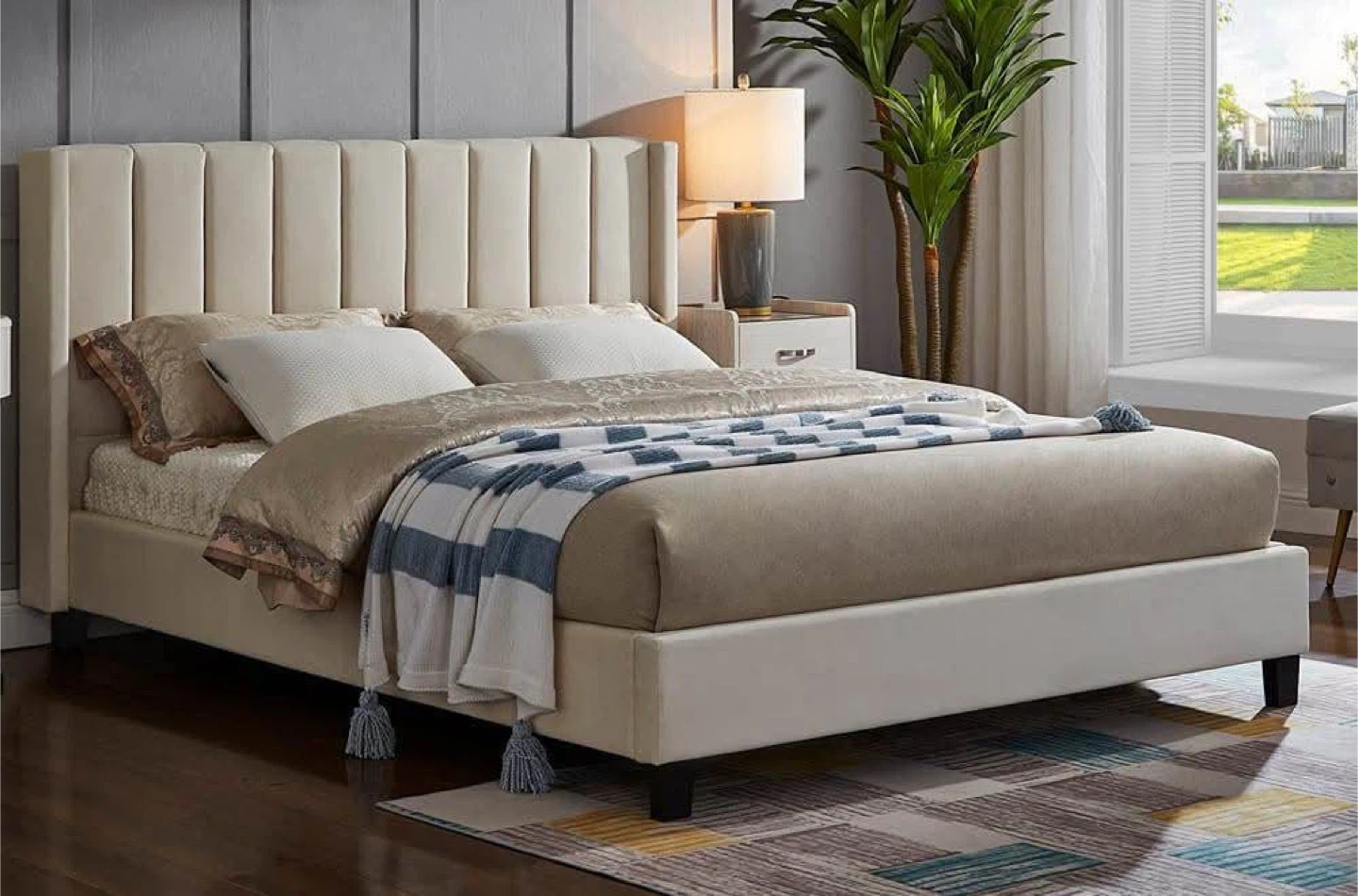 Stylish king size bed frame in white upholstery. Features a tall, vertical tufted headboard and sturdy wooden slat support system. No box spring needed for this modern bed base!
