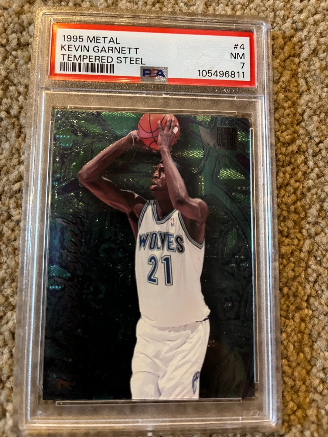 This is a 1995 Metal Kevin Garnett Tempered Steel basketball card. It's graded PSA 7 NM. It features Kevin Garnett wearing his Wolves jersey with number 21.