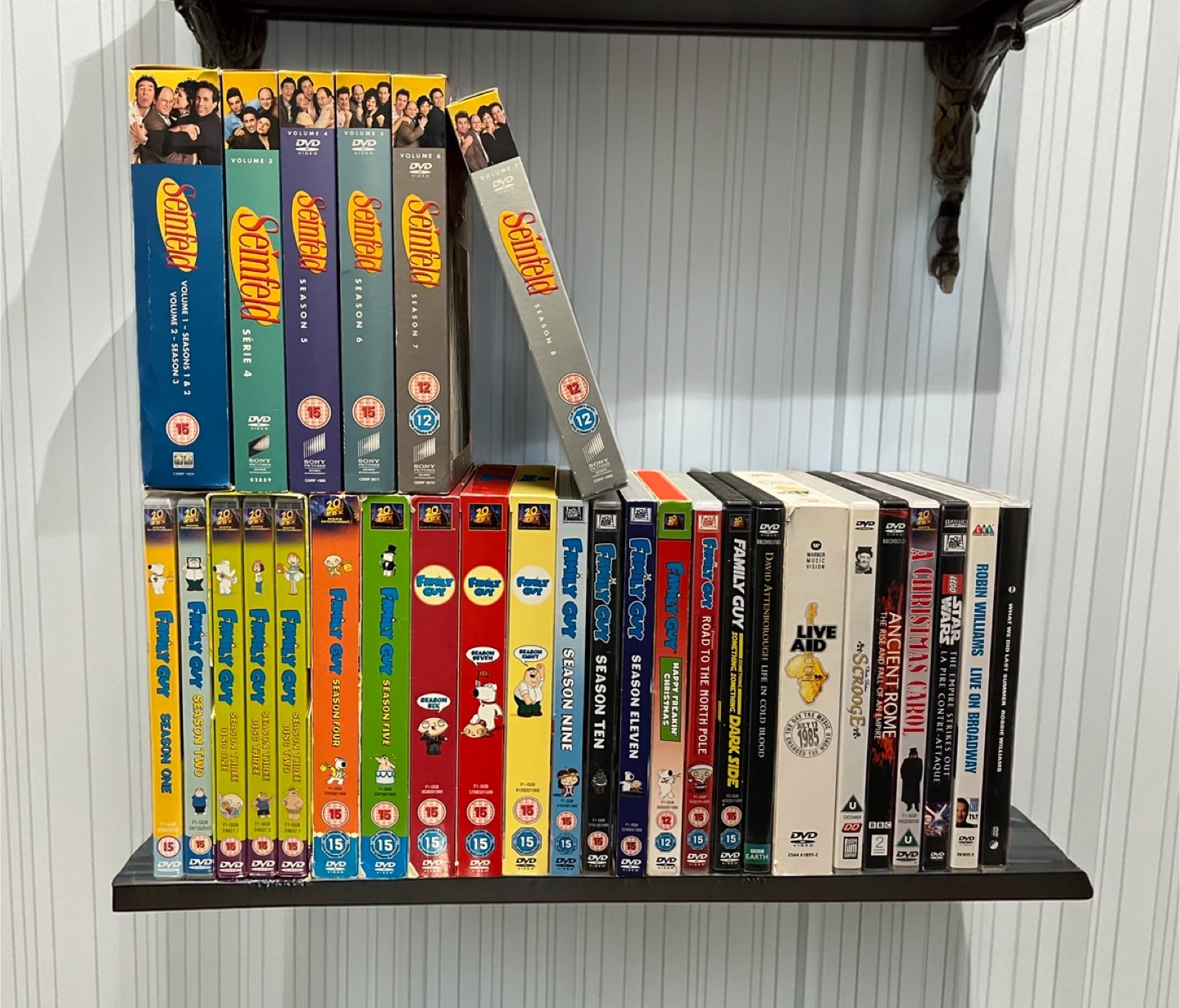 Family Guy seasons 1 to 11, plus 2 Christmas episodes and 1 Star Wars parody. Seinfeld seasons 1 to 8. Box set of 4 disks of Live Aid consort. Plus 7 assorted DVD’s. All DVD’s will play on the NTSC and PAL (North America and Europe) TV systems.
