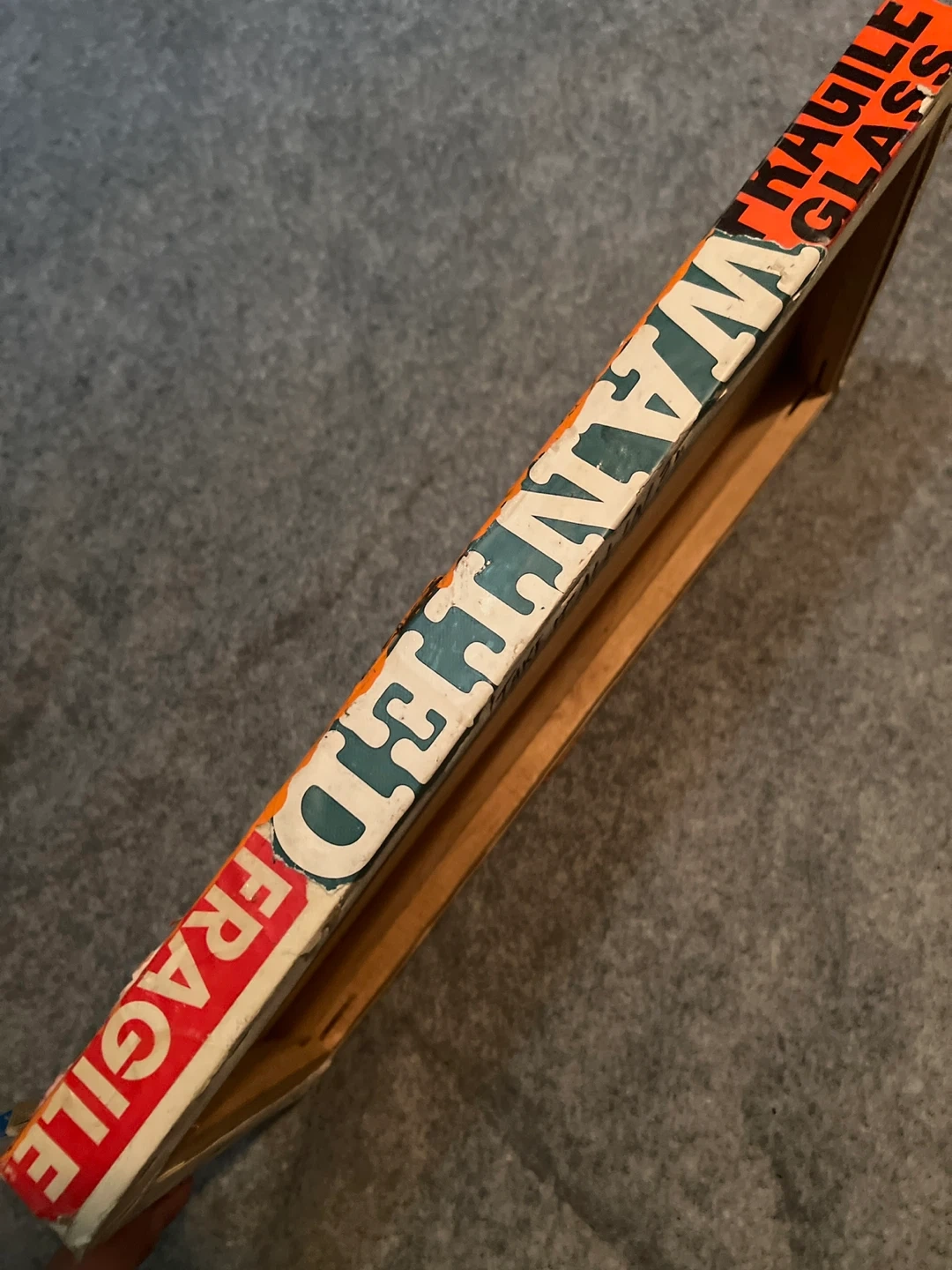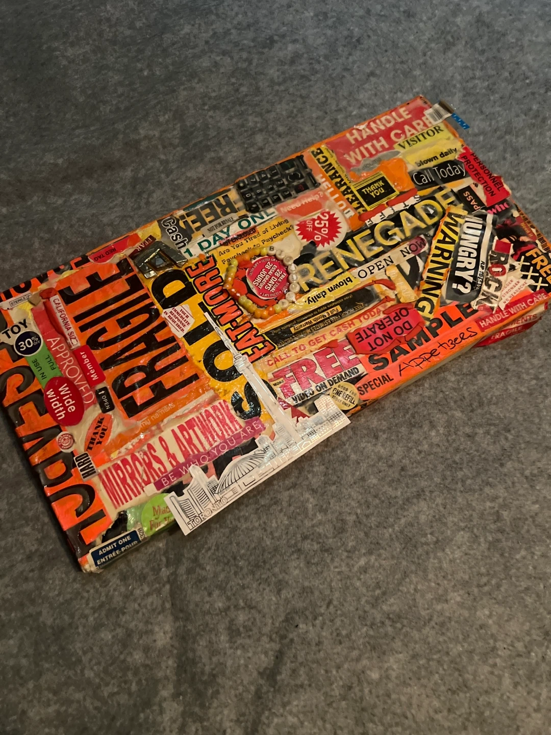 This is a unique art piece featuring a collage of various stickers and labels. It has a 'Fragile' warning and 'Handle with Care' instructions. The artwork is designed to catch the eye with its busy, layered aesthetic. It's ready to be displayed!