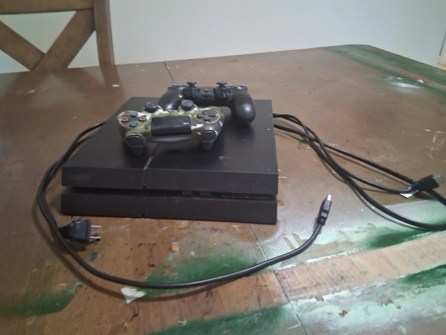 This is a black Sony PlayStation 4 console. It comes with two controllers, one in black and one with a camouflage design. Power, charging & HDMI cables are included. Ready for gaming!