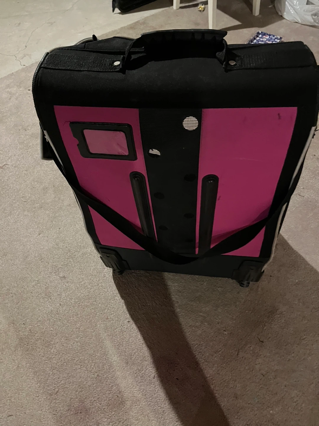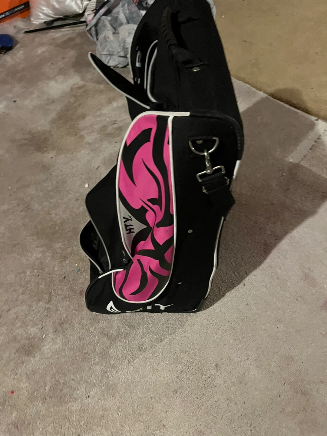 This is a black and pink HTX hockey bag with wheels. It's made of durable material and has a large main compartment. This bag is designed for carrying hockey gear.