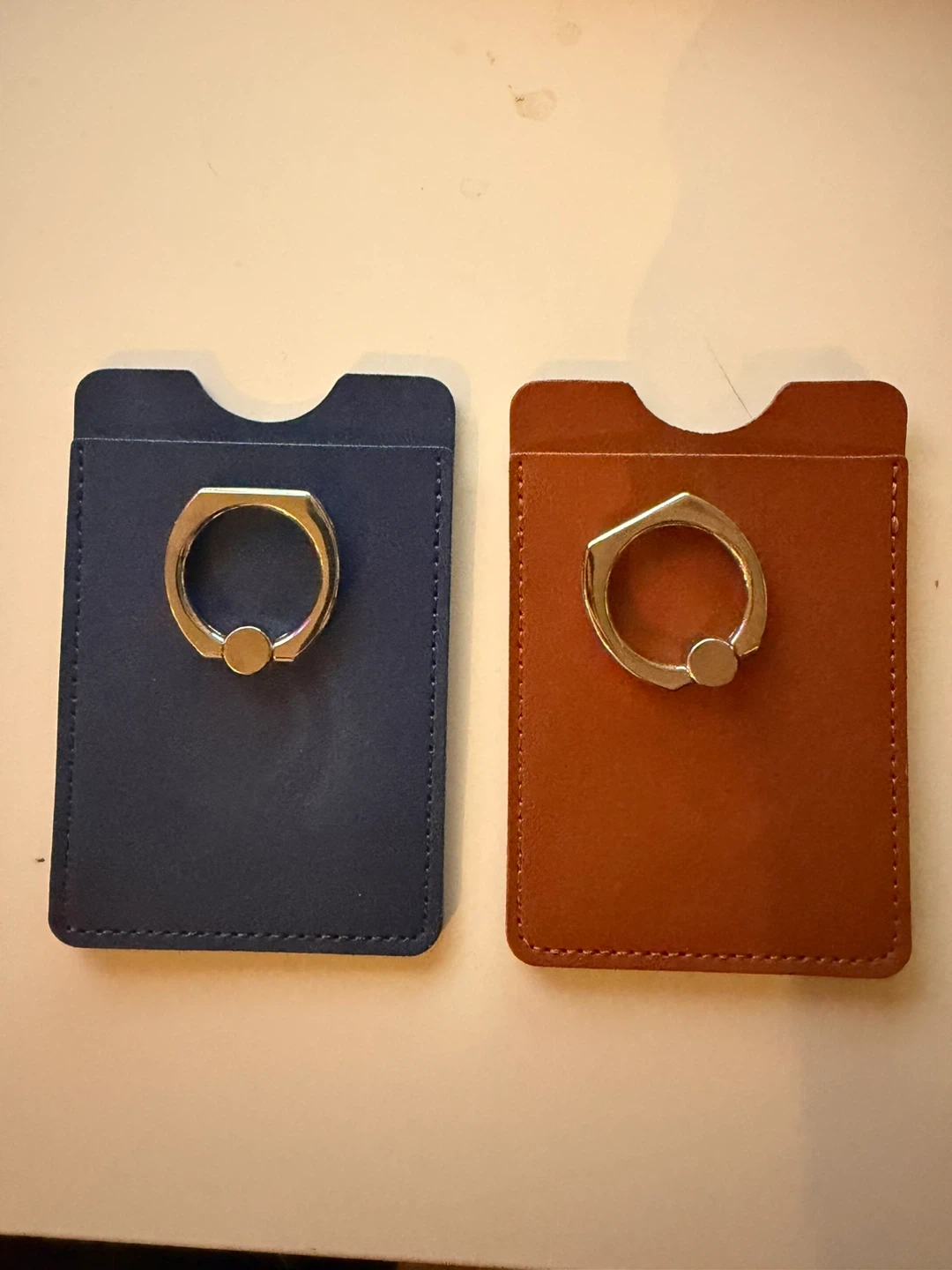 Two handy self adhesive card holder pouches for your phone, one in a deep blue and the other a rich brown. Each features a rotating ring stand for convenient viewing. Great for keeping essentials close by!