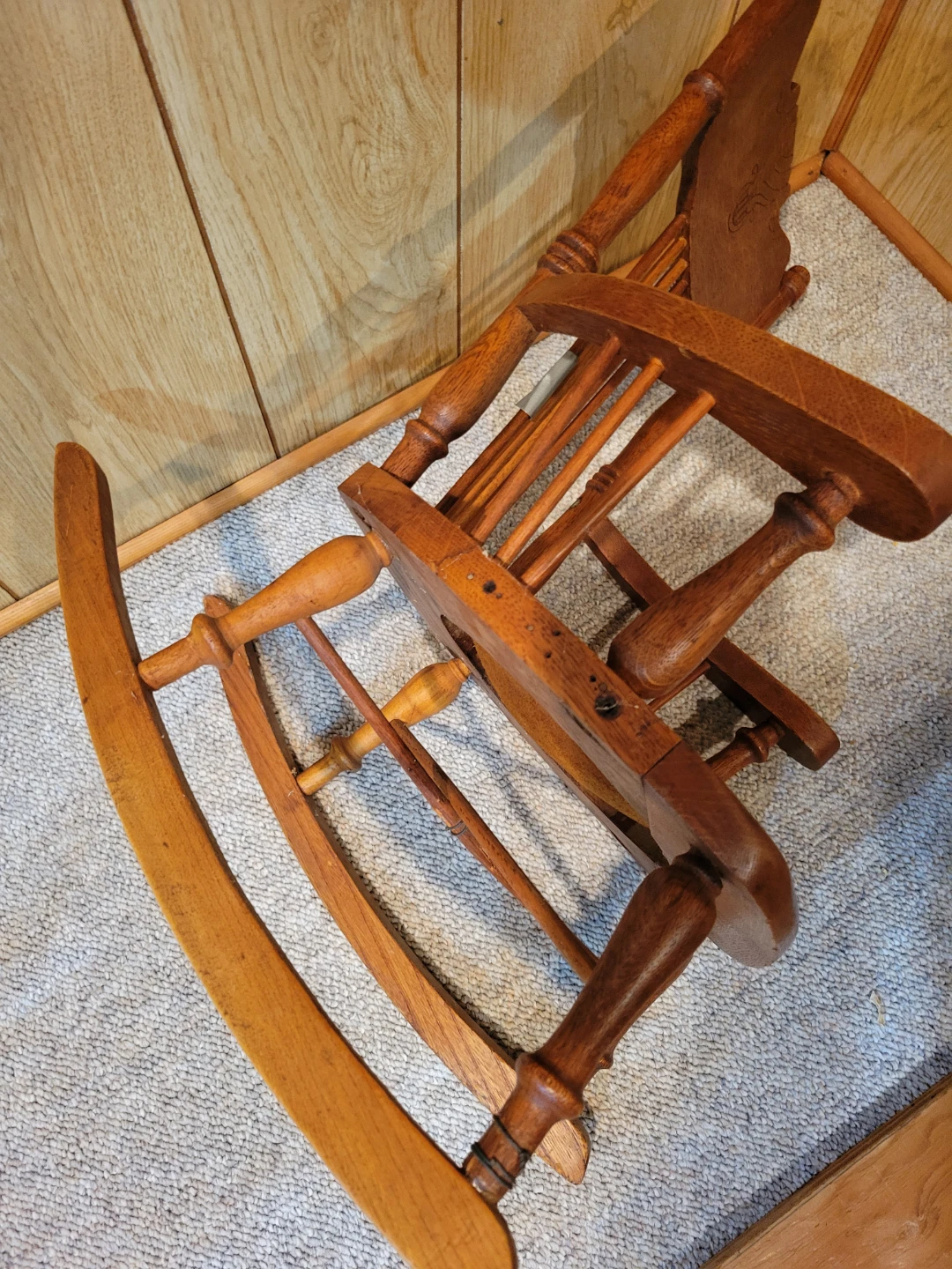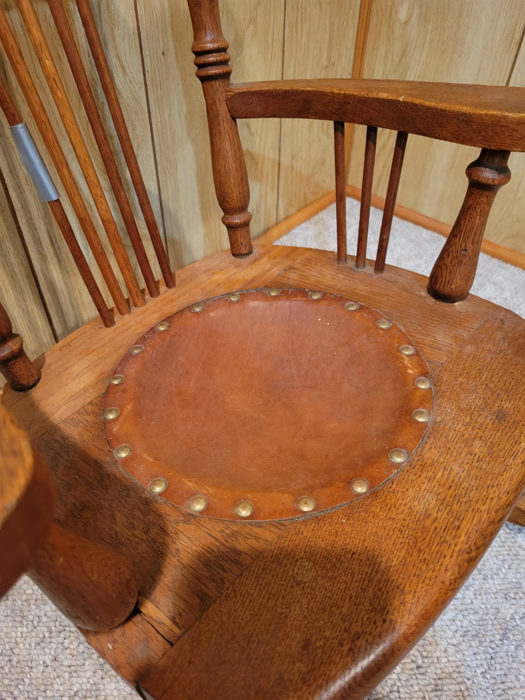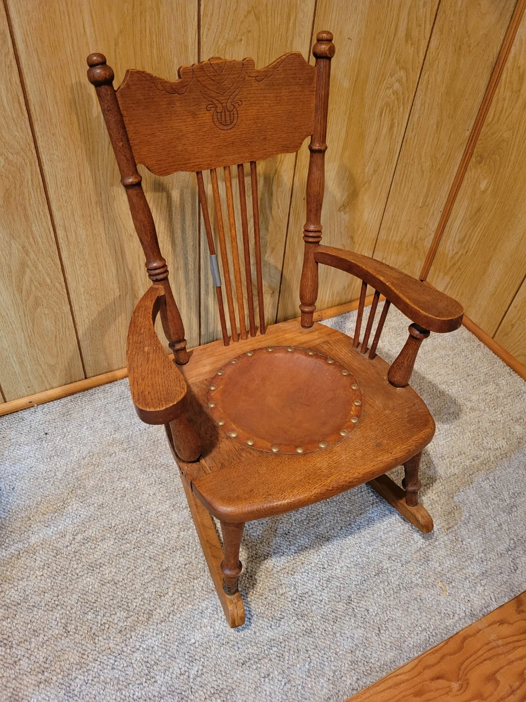 This is a classic wooden rocking chair. It features a carved detail on the backrest and a round leather seat. The wood has a warm, natural finish. This is a children's chair with minor repair needed. Great little project for someone. Approximately 60-70 years old.