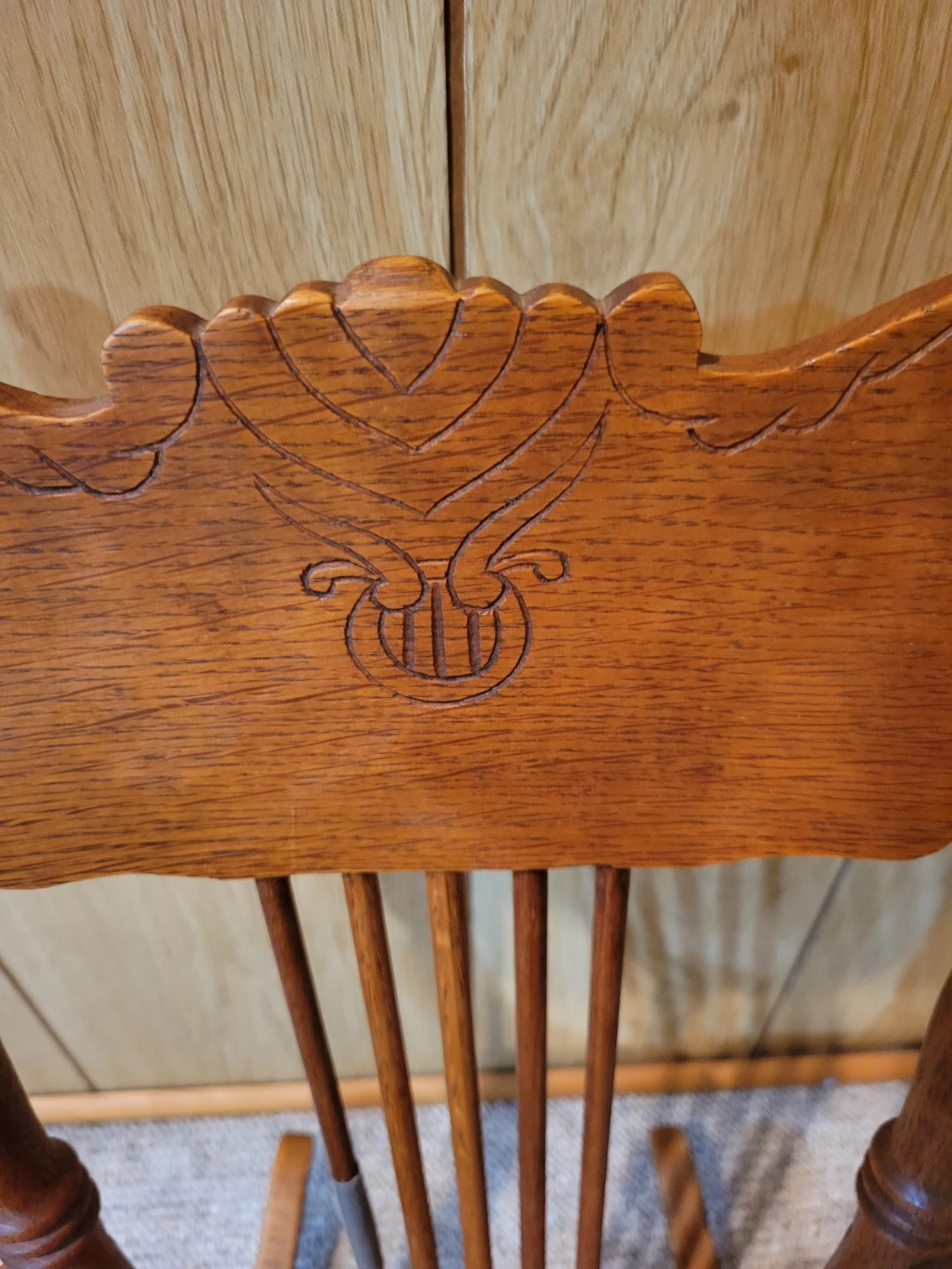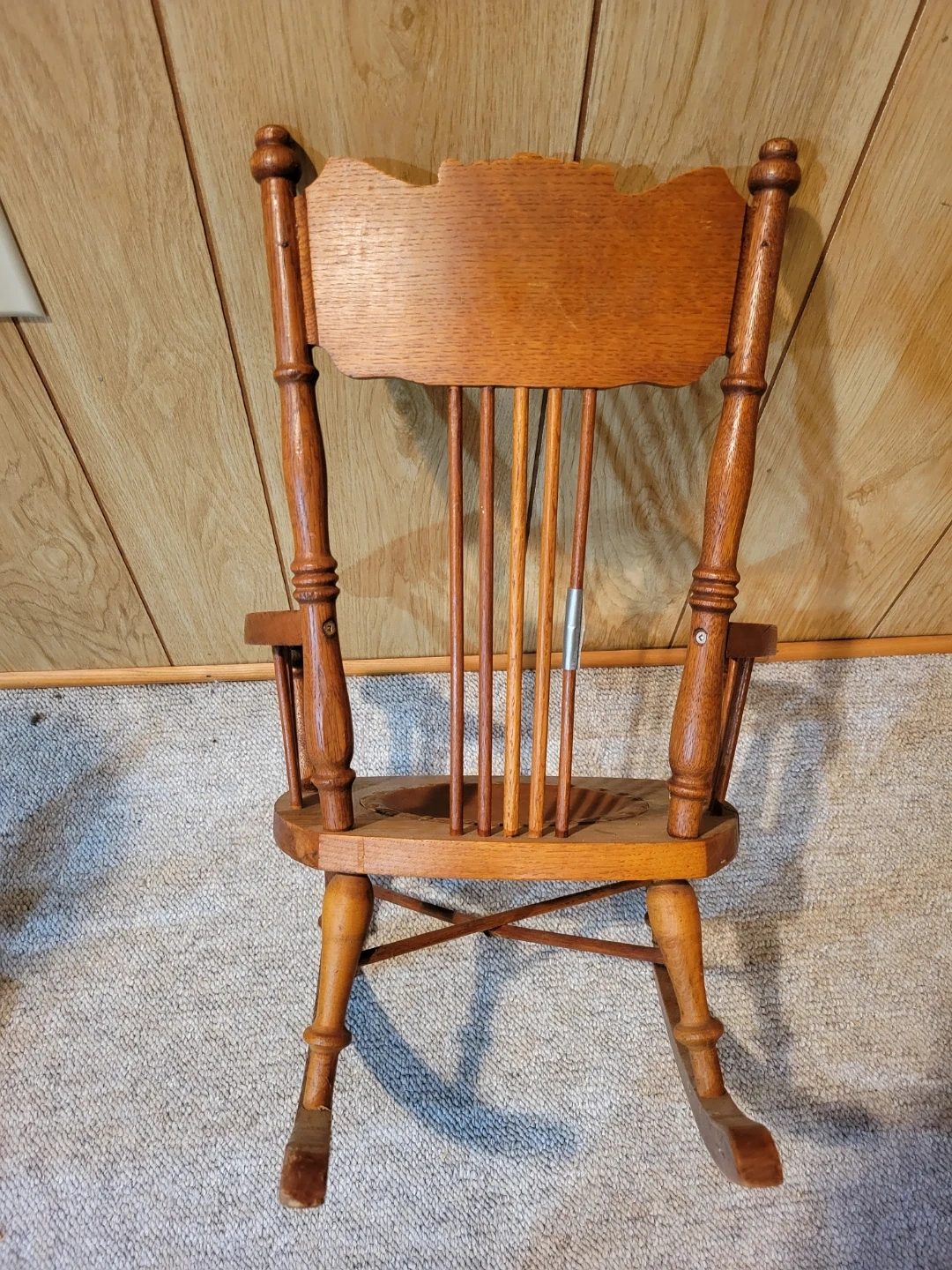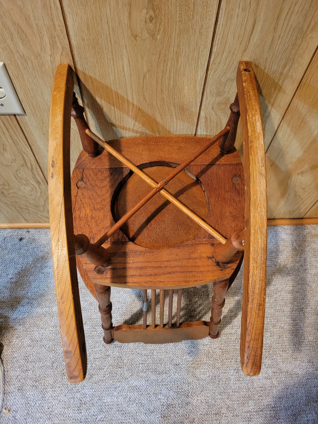 This is a classic wooden rocking chair. It features a carved detail on the backrest and a round leather seat. The wood has a warm, natural finish. This is a children's chair with minor repair needed. Great little project for someone. Approximately 60-70 years old.