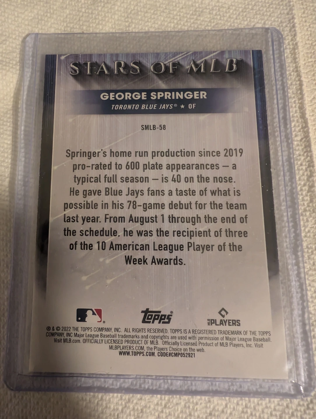 This is a 2022 Topps Stars of MLB trading card featuring George Springer of the Toronto Blue Jays. The card celebrates his home run production and accolades. It's in a protective sleeve.