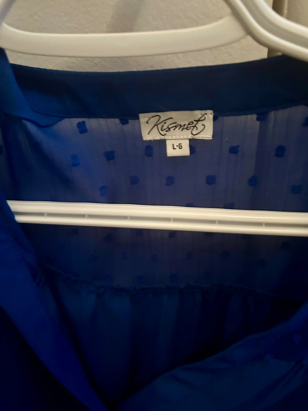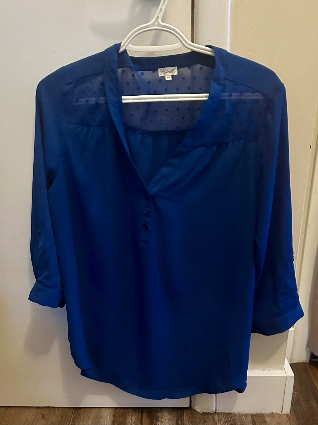 This Kismet blouse is a lovely royal blue. It's a size L-G with a sheer overlay featuring a subtle dot pattern. The sleeves are a 3/4 length with a roll-tab detail. It buttons partially at the neck.