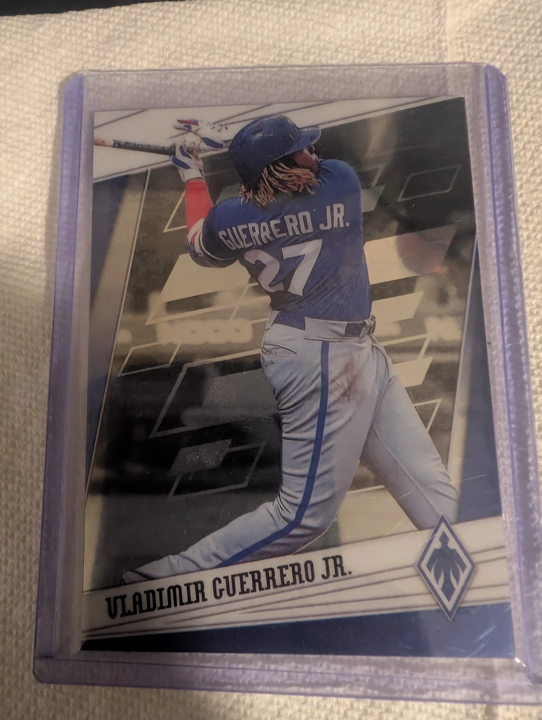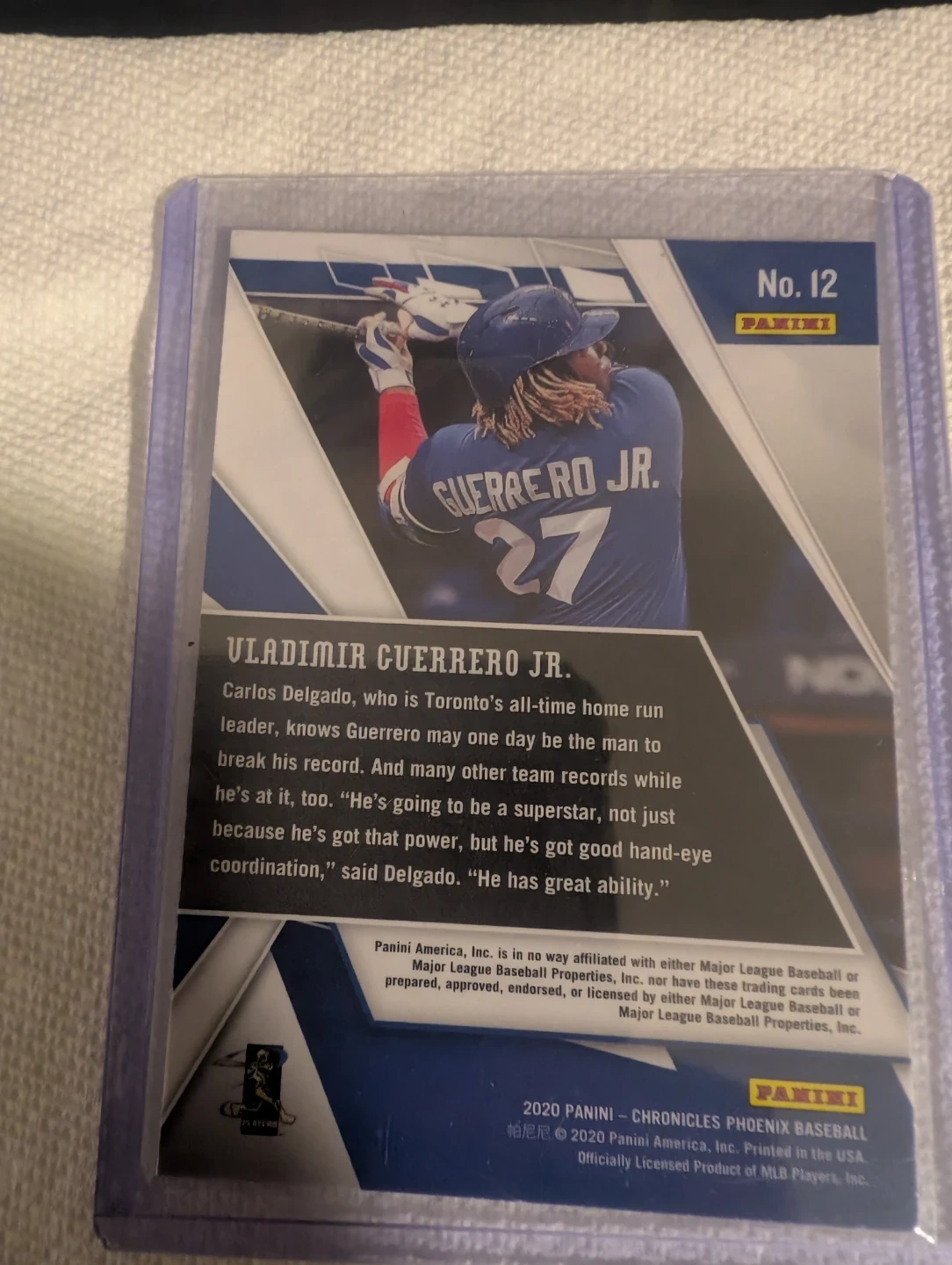 This is a 2020 Panini Chronicles Phoenix Baseball card featuring Vladimir Guerrero Jr. It's card number 12 and officially licensed by MLB Players, Inc. A great addition for any baseball card collector!