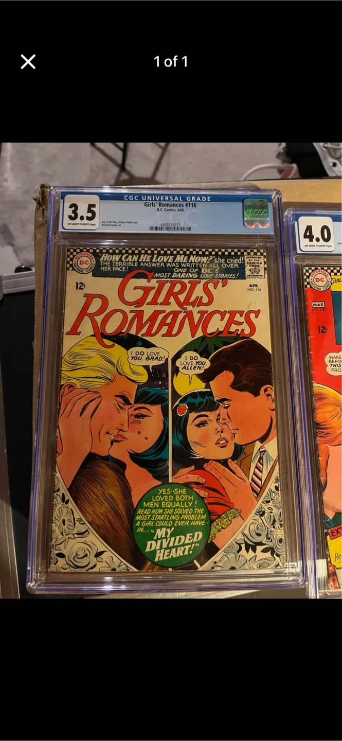 This is Girls' Romances #116, graded 3.5 by CGC. It's a comic book from D.C. Comics, published in April 1965. The issue features the story "My Divided Heart!".