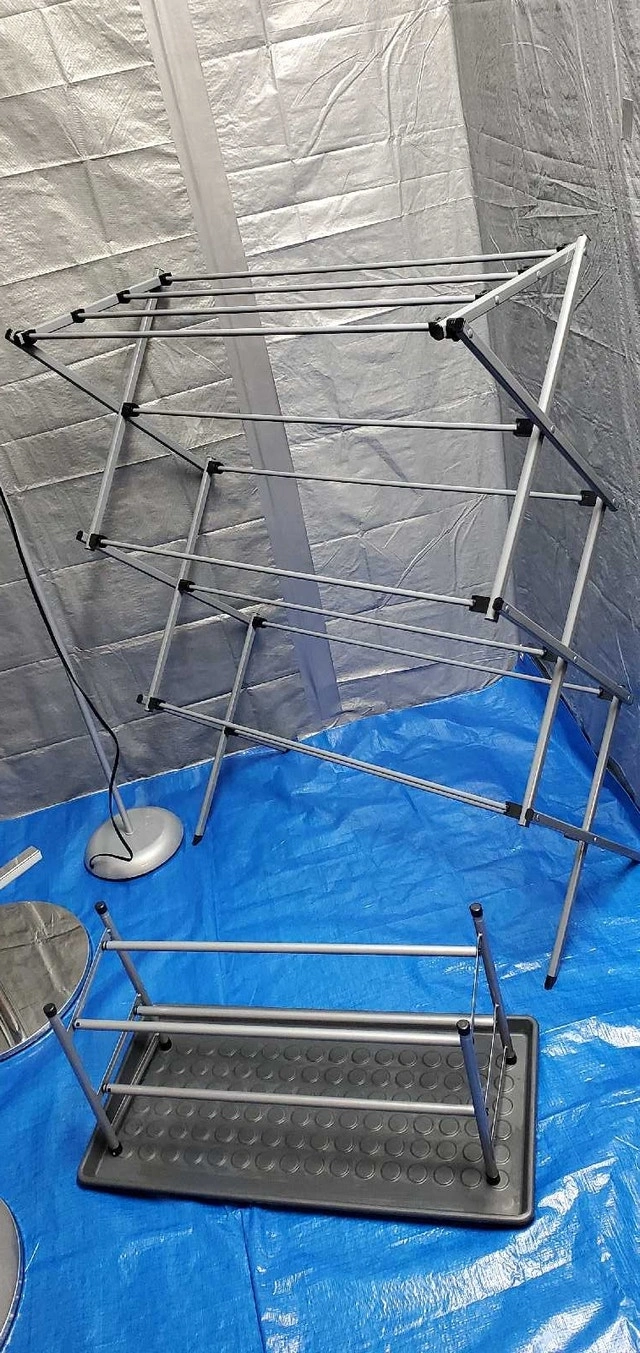 This combo deal includes a Honey-Can-Do grey steel folding clothes drying rack, an IKEA shoe tray and 2-tier extendable metal shoe rack, and an Ikea uplighter floor lamp, all in used but good condition, perfect for organizing your home. The items show some signs of use but are fully functional and ready to help you maximize your space. Here are some details about each item: