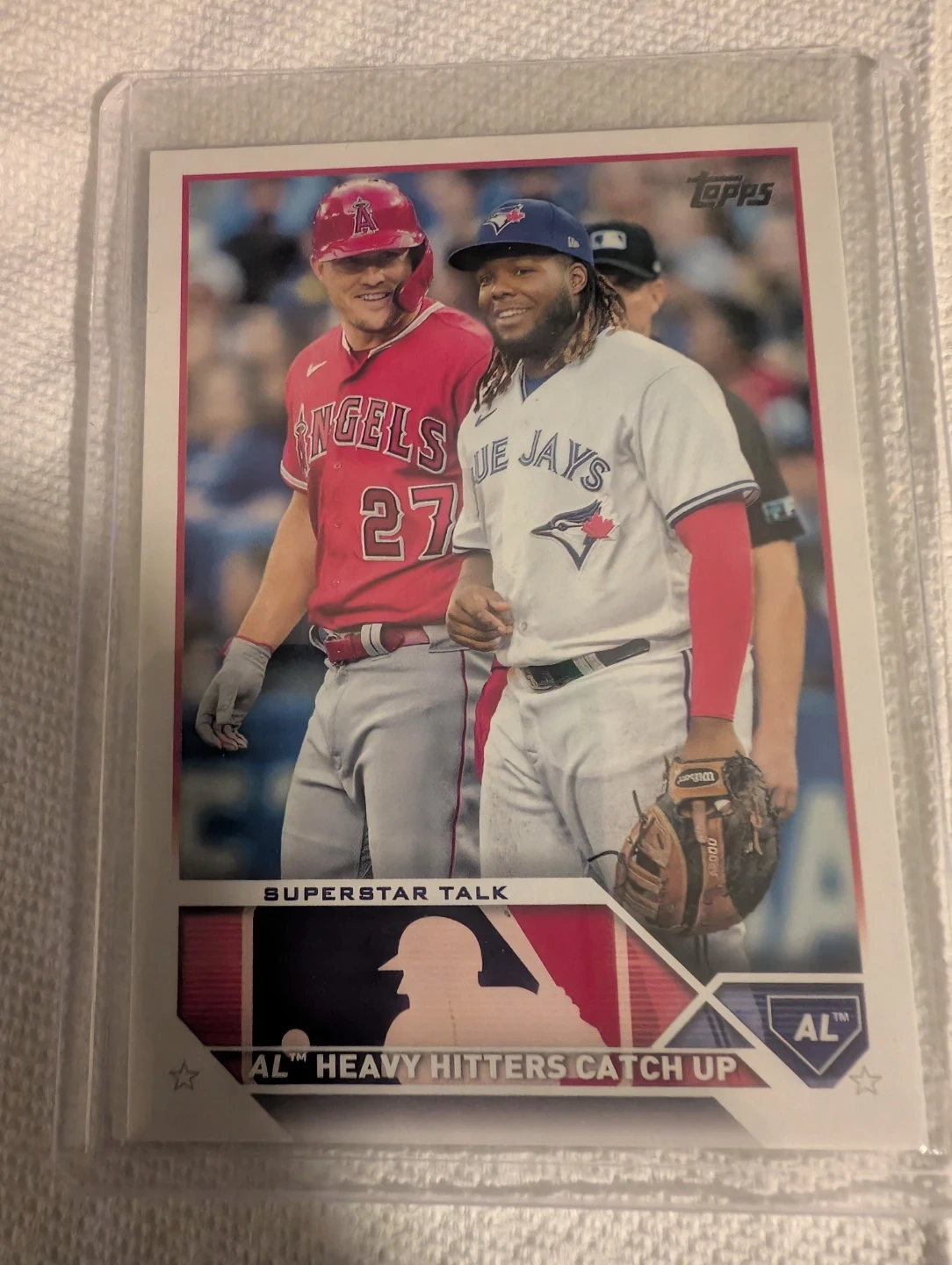 This is a 2023 Topps Series 2 baseball card featuring "Superstar Talk" with "AL Heavy Hitters Catch Up". The card showcases Shohei Ohtani and Vladimir Guerrero Jr. It's a great addition for any baseball card collector.
