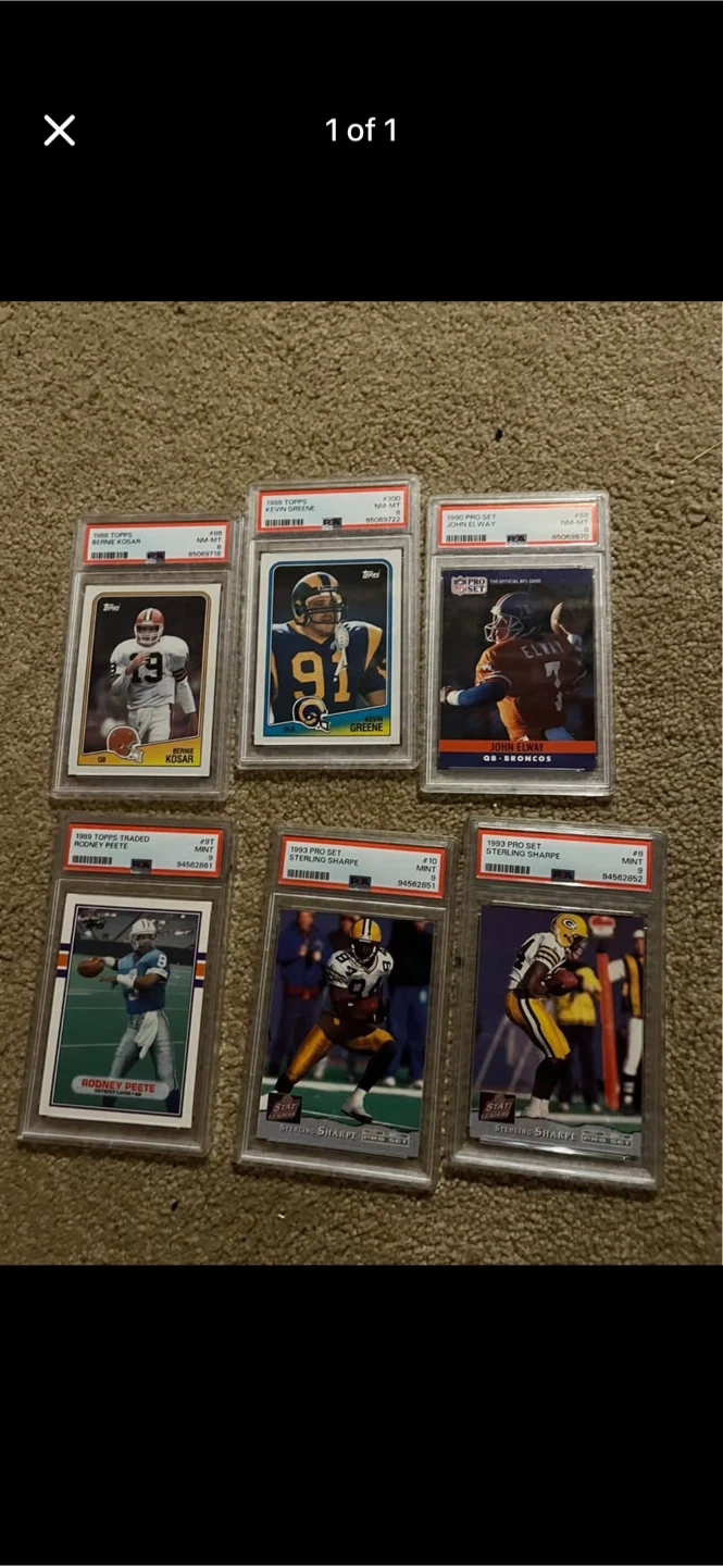 A set of six graded NFL football cards featuring Bernie Kosar, Kevin Greene, John Elway, Rodney Peete, and two Sterling Sharpe cards. Each card is professionally graded and encased.