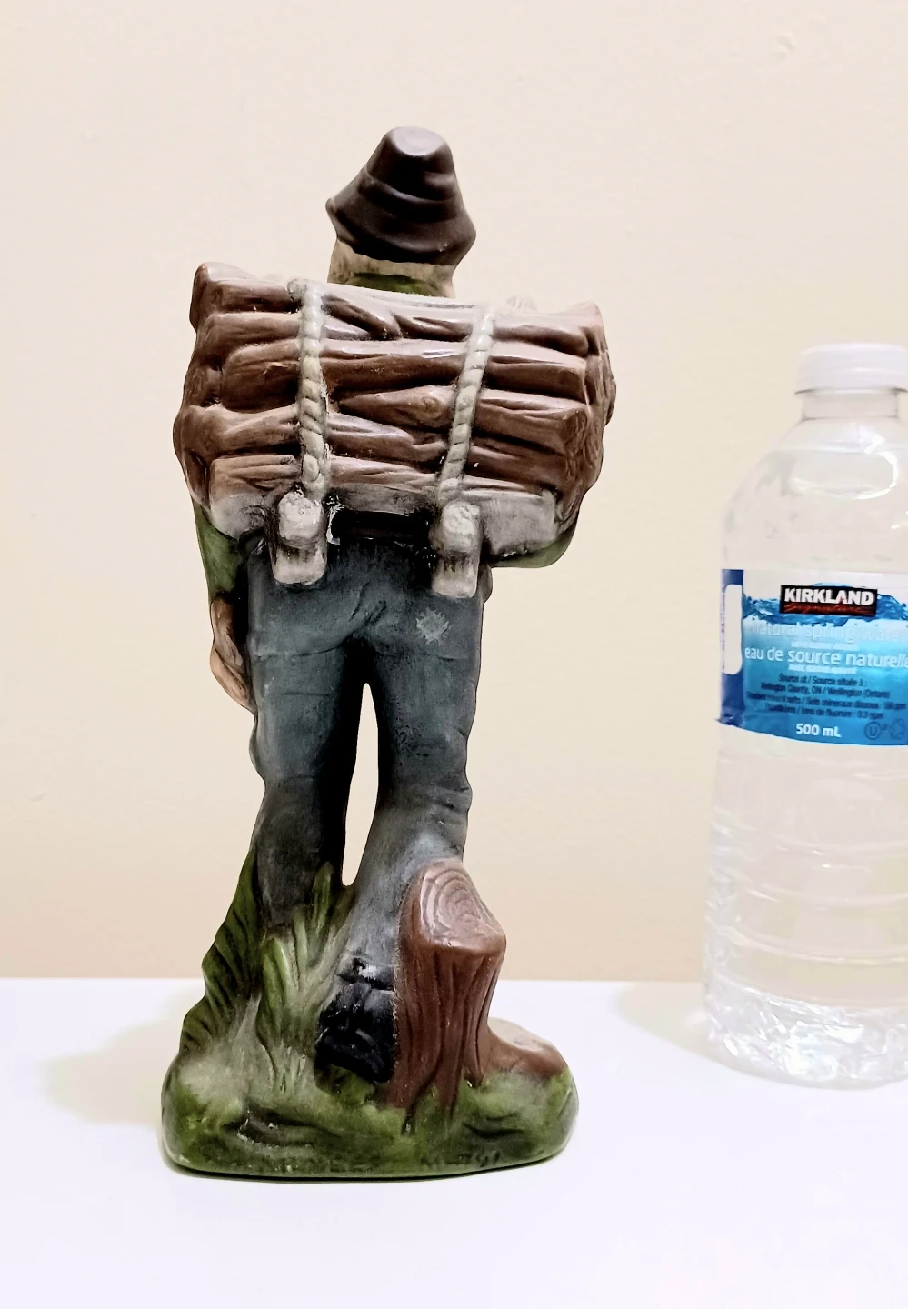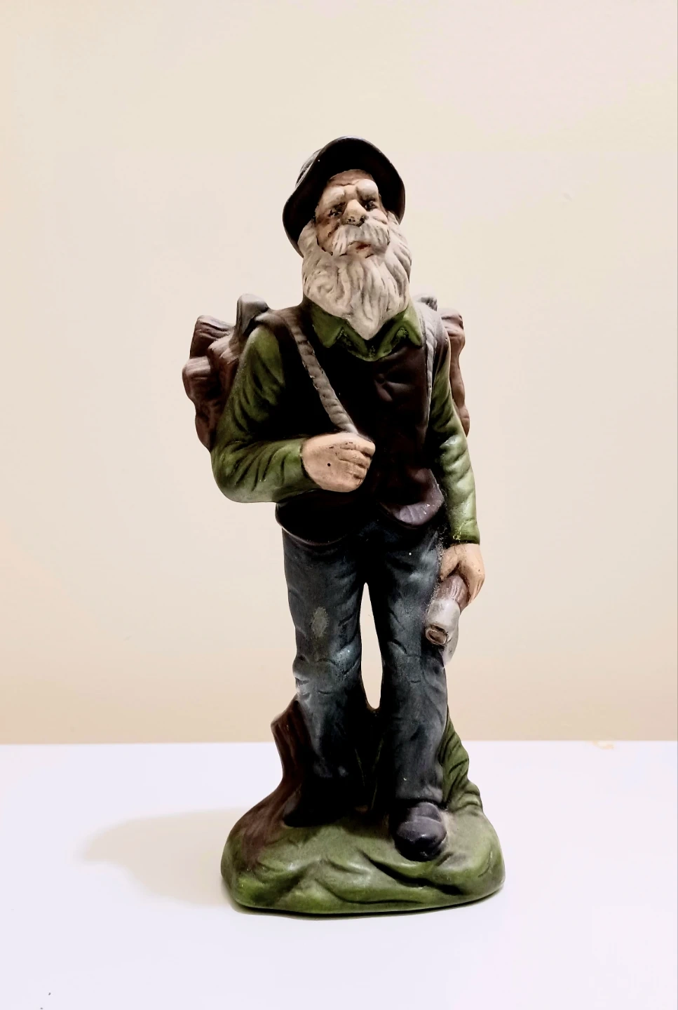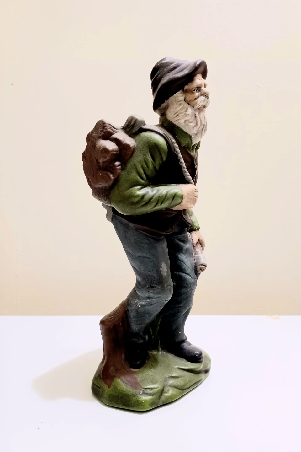 This is a Vintage, Handmade German figurine from 1981. The figurine depicts a Woodsman with a load of firewood,and holding an axe .