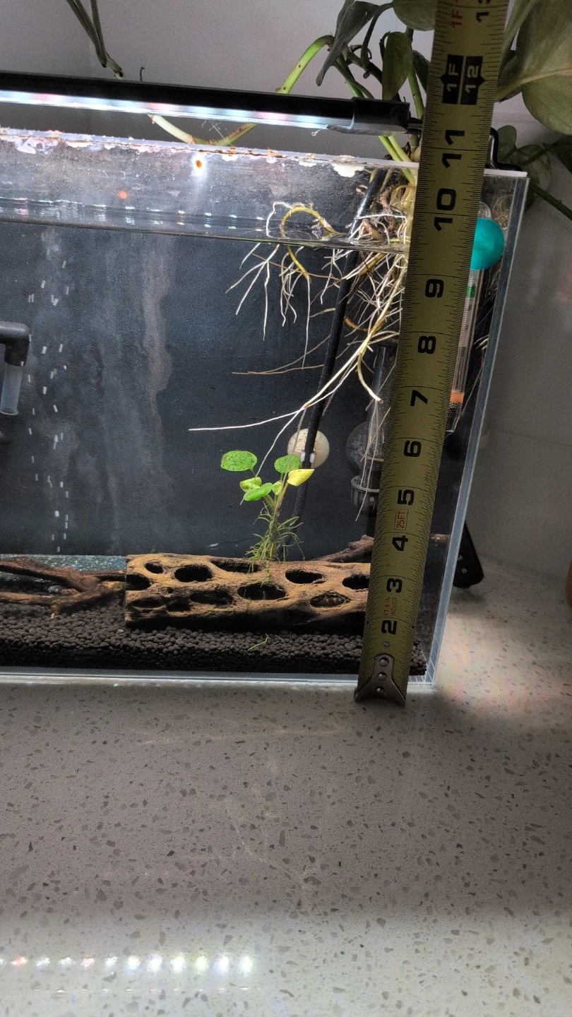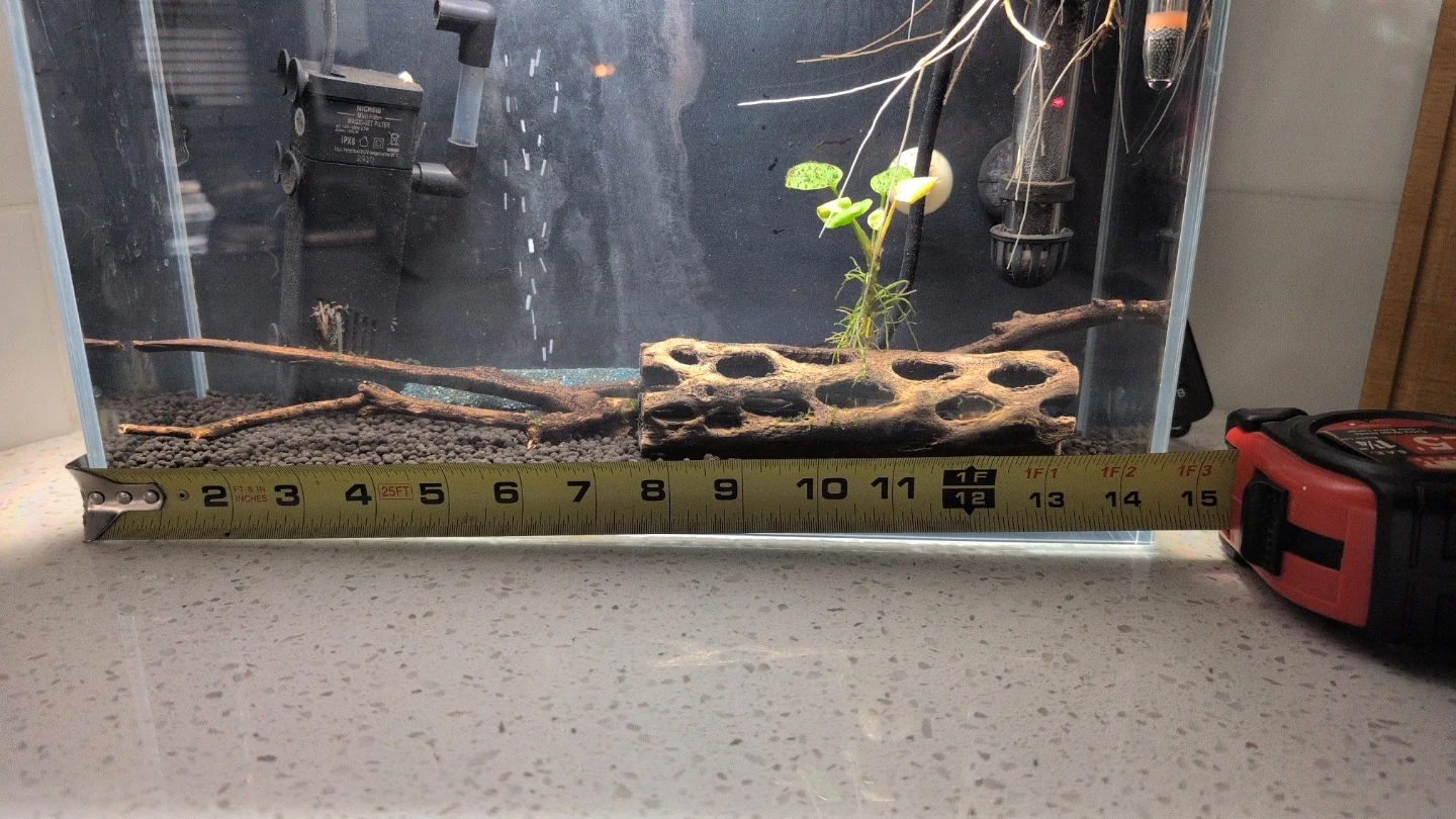 Selling glass aquarium, wood decor, anibia's plant, filter, heater, thermometer, air pump, air stone, LED light, and 4-5 Cooley loaches. It measures approximately 15 inches long, 6 inches wide, and 10 inches tall.