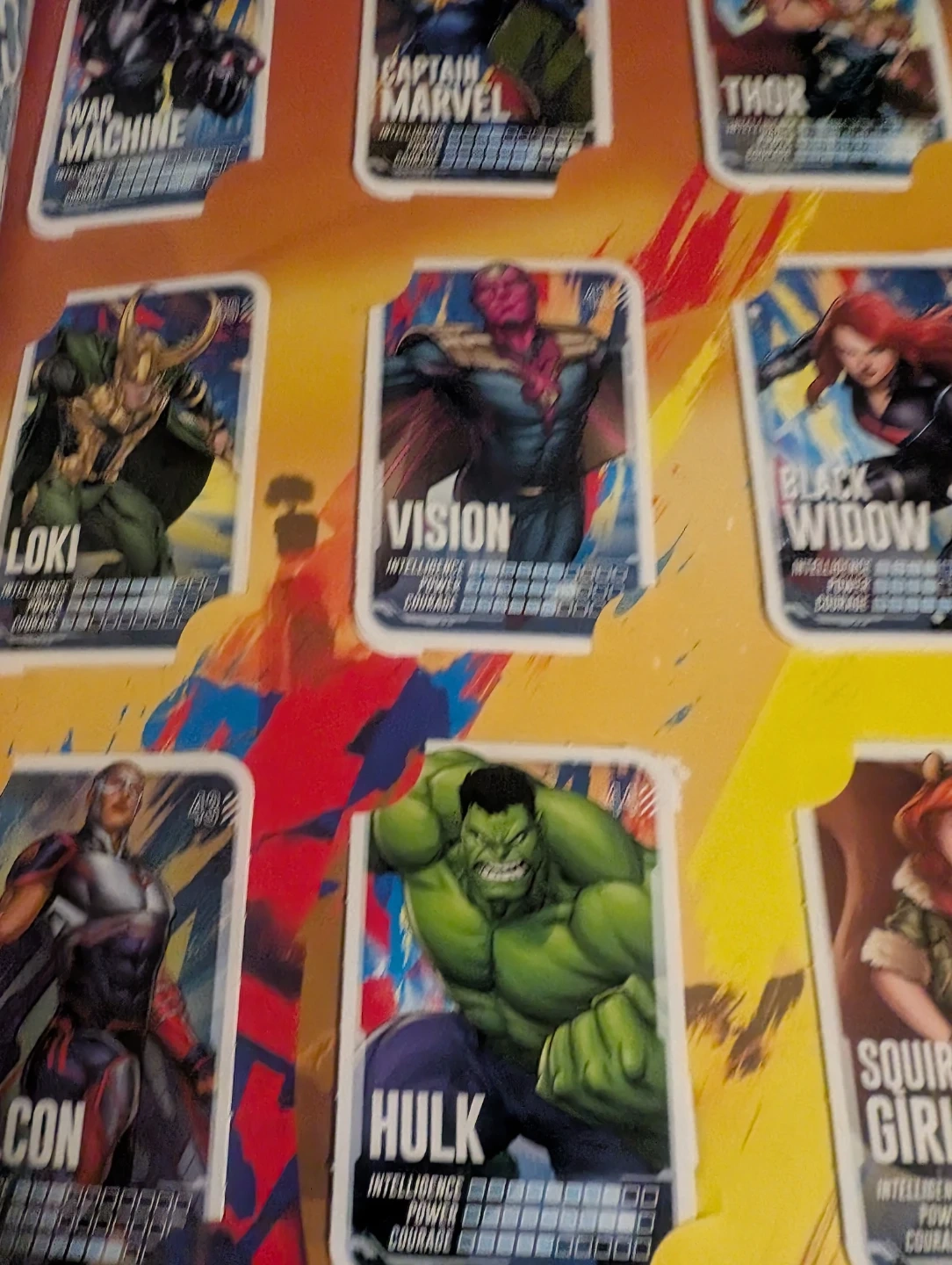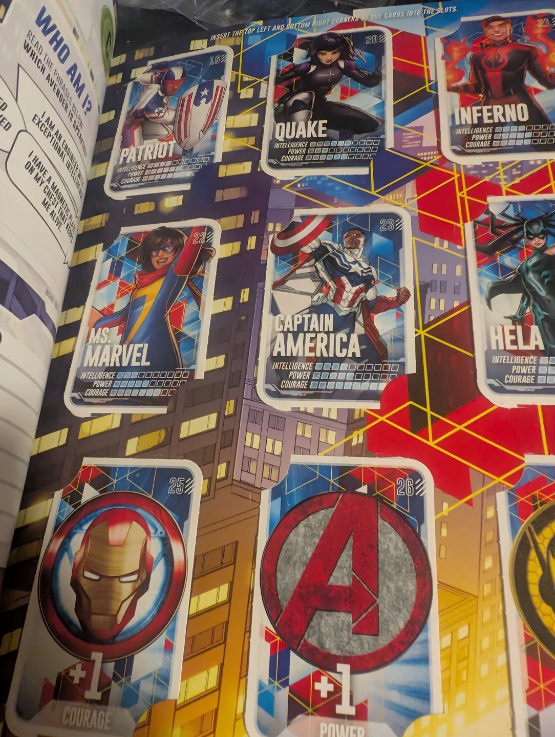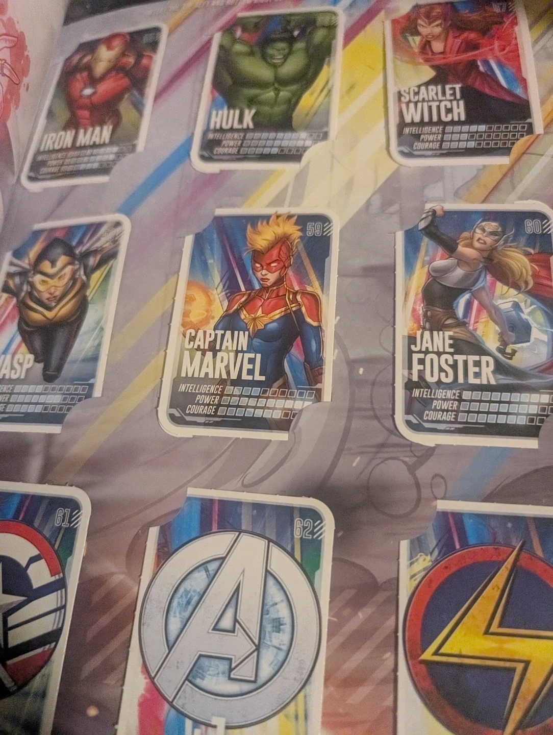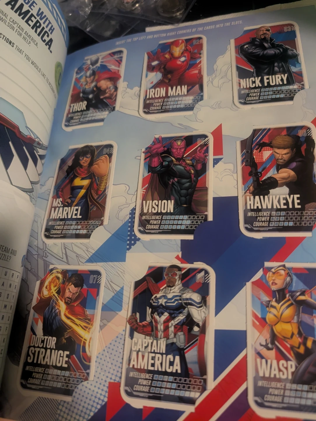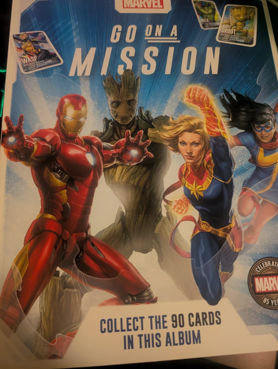 This Marvel Go On A Mission album is for collecting 90 cards. It features popular characters like Captain America, Iron Man, and Ms. Marvel. The album includes spaces to organize your card collection. Comes with all 90 cards