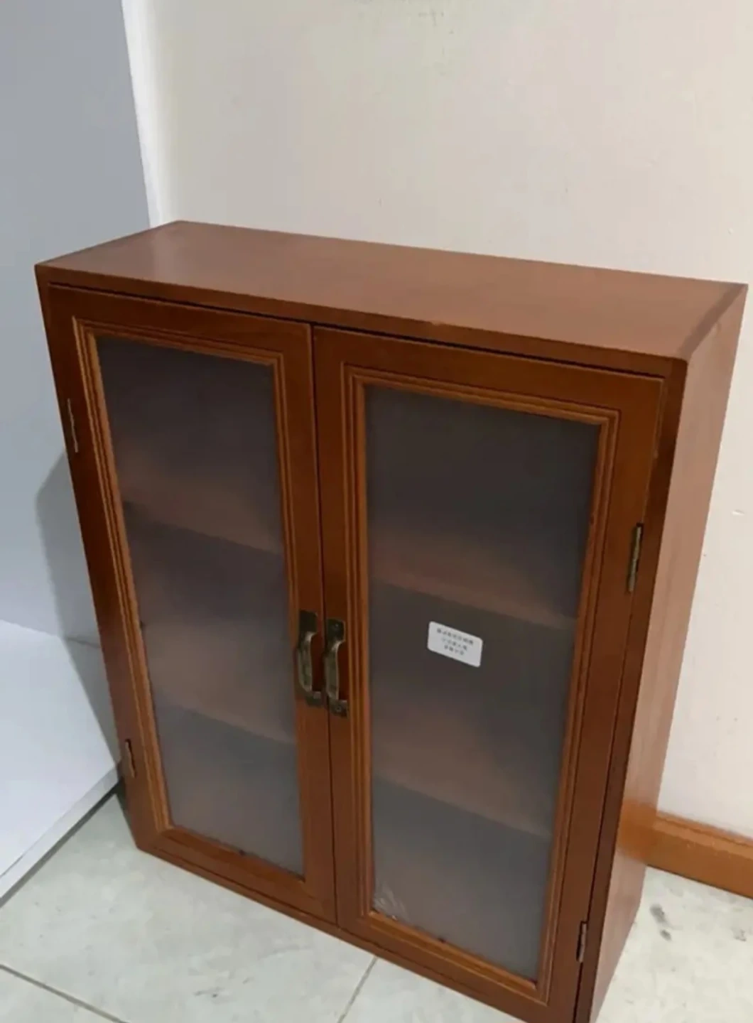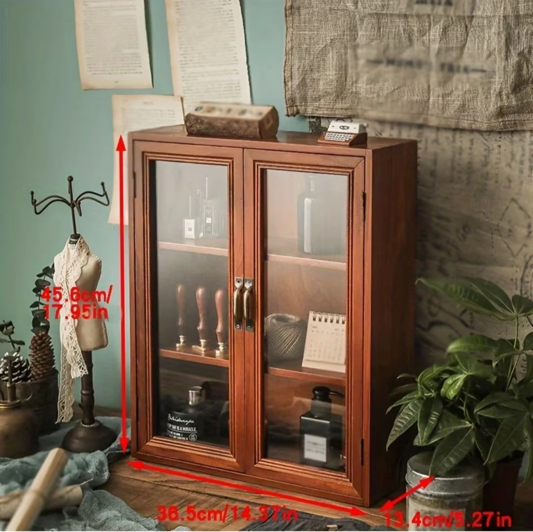 This charming wooden cabinet features two glass doors for displaying your favourite items. It has a compact size, perfect for tabletops or shelves. Measures 36.5cm wide, 45.6cm tall, and 13.4cm deep.