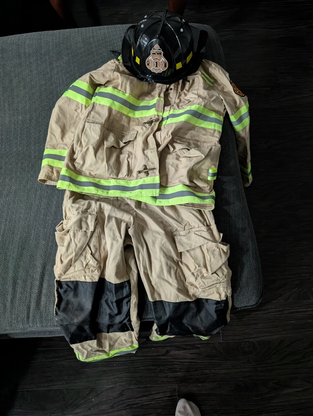 This set includes a tan firefighter jacket and pants with reflective lime-green stripes. A black helmet with a badge is also included. Reinforced black panels on the lower legs. Size 7-8 Best offer!