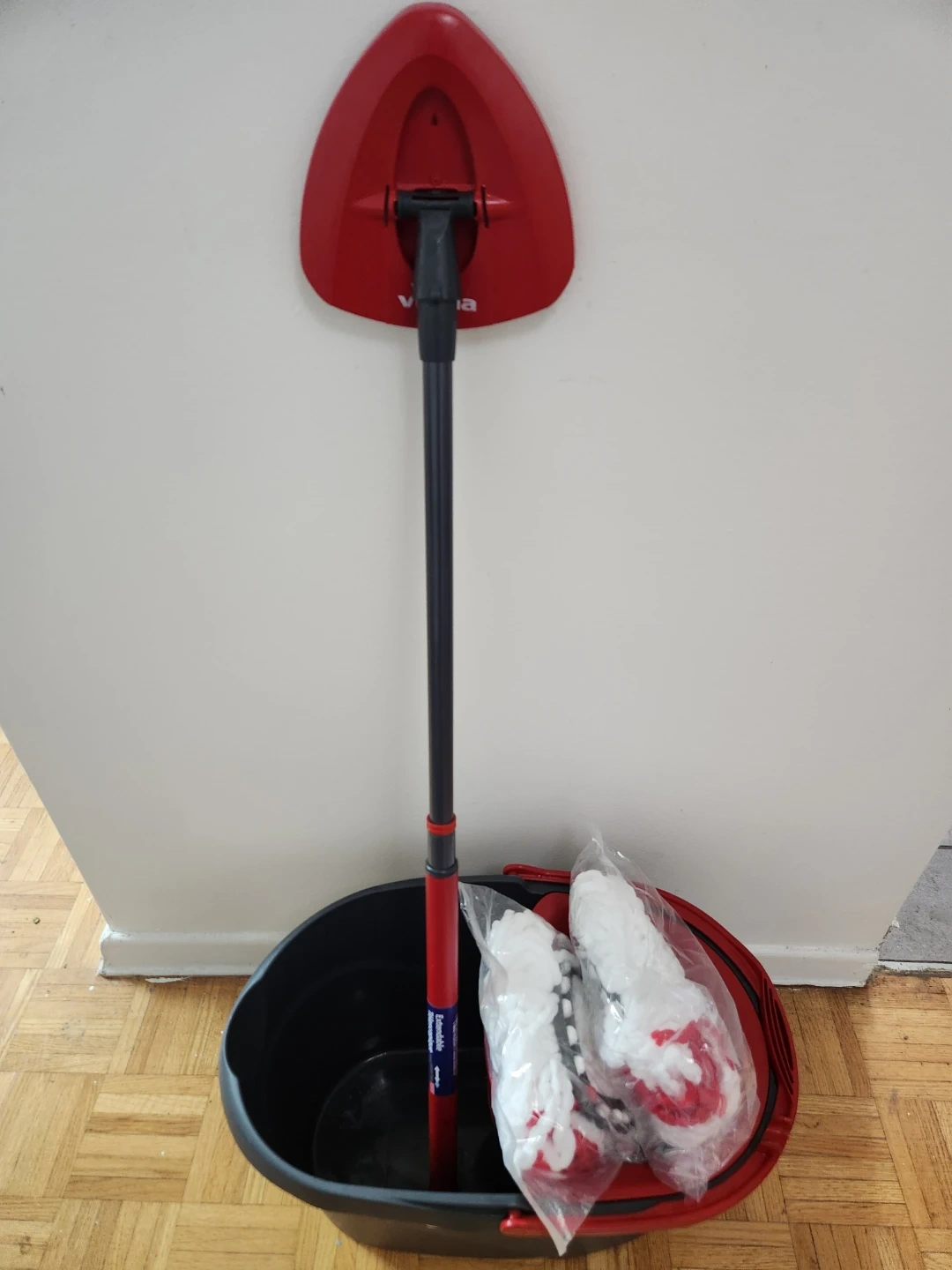 This Vileda Easy Wring Ultramat mop and bucket set comes with a spin mop and a red bucket. It includes two refill heads in plastic packaging. The mop has a telescopic handle for adjustable height. It's great for cleaning all hard floor surfaces!