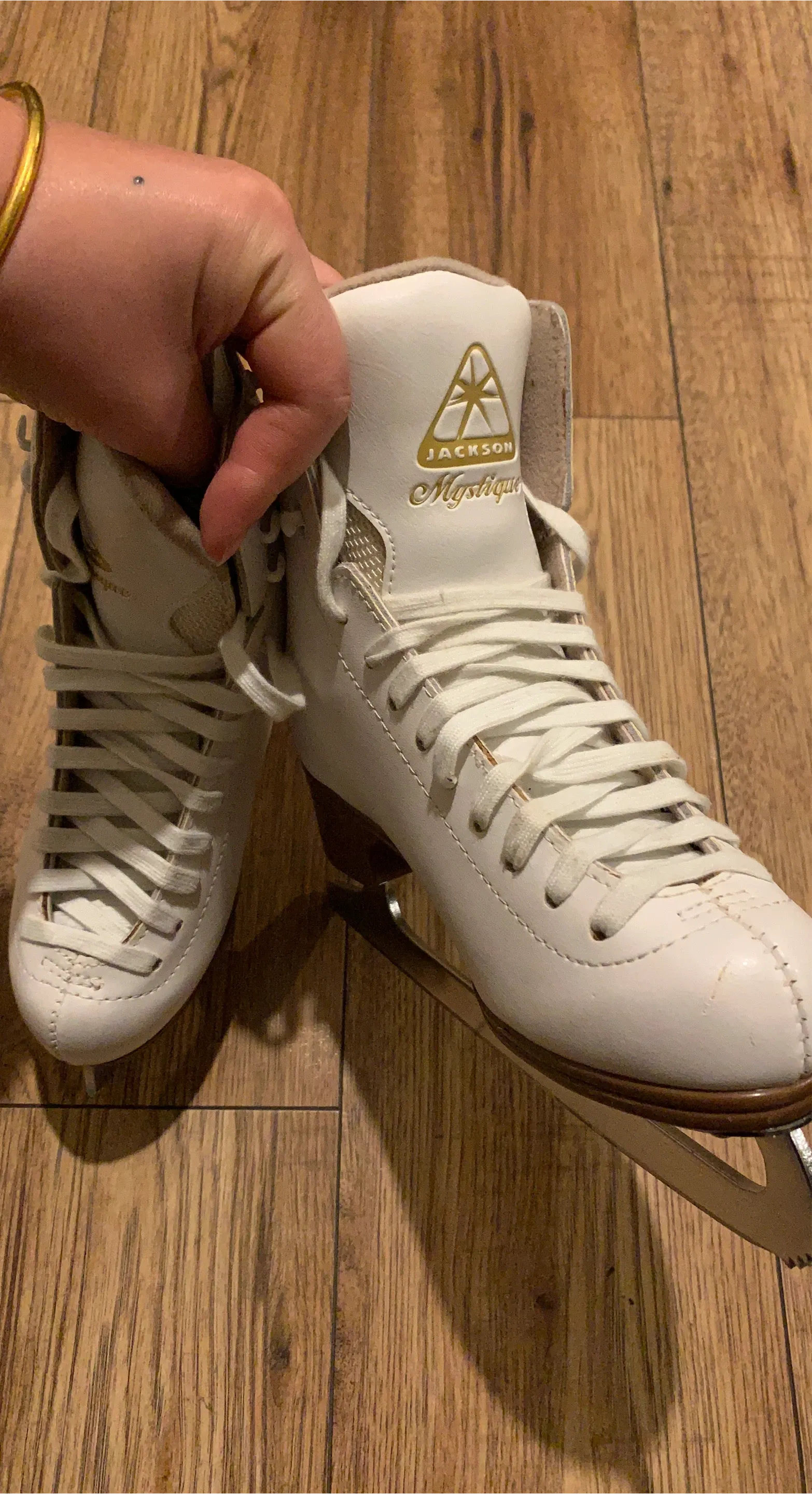 White Jackson Mystique figure skates. These skates feature a classic design with white laces and gold accents. Perfect for aspiring skaters looking for a reliable and stylish option on the ice!Richmond pick up cash only