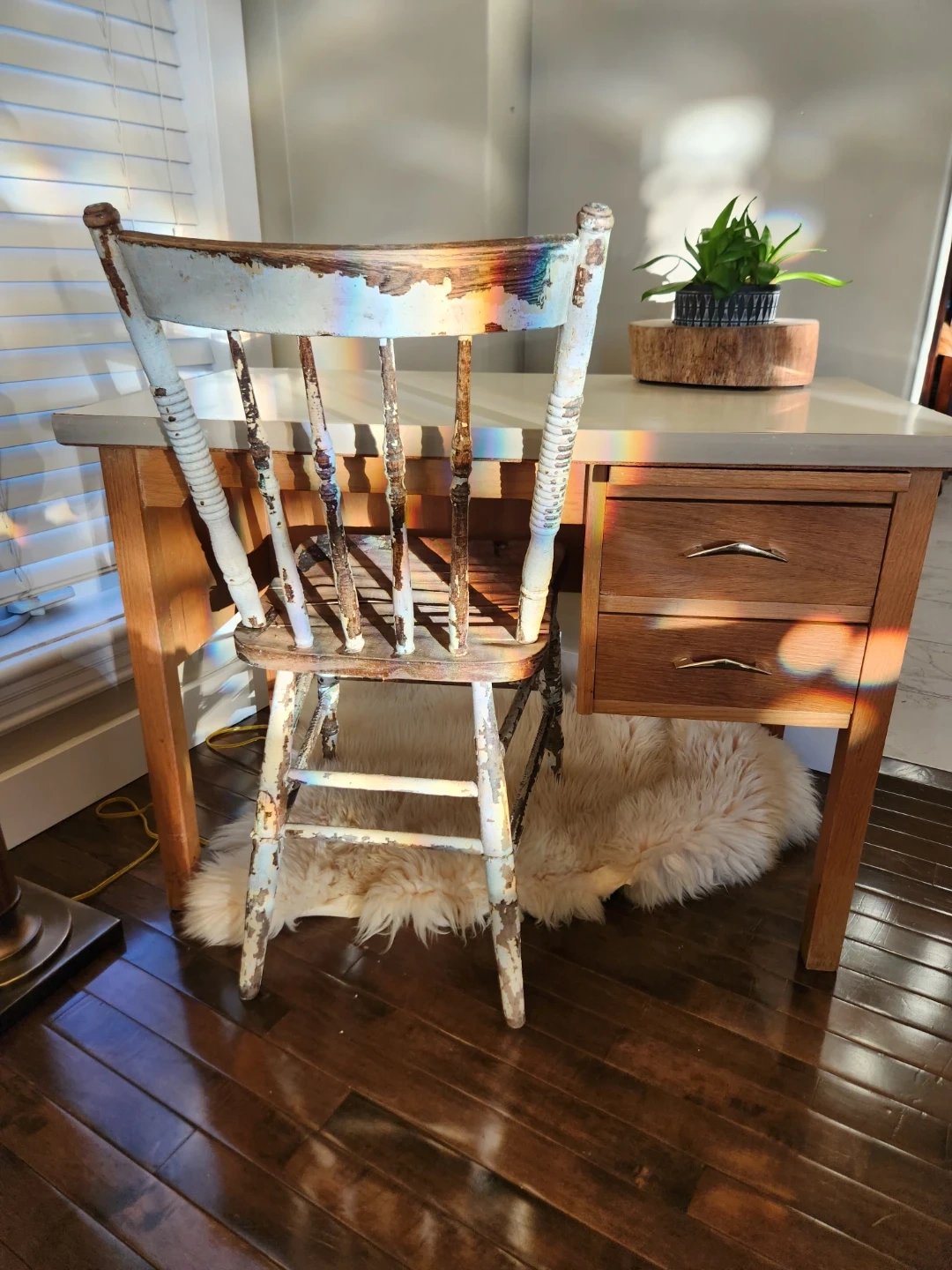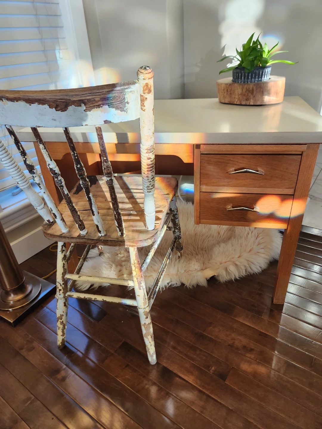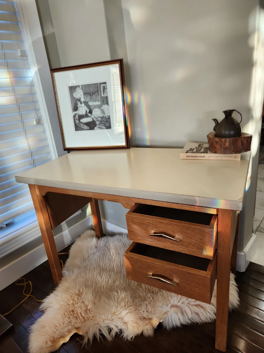 1950's MICRO desk features a light-coloured laminate top, it could use a bit of TLC, but the desk is super sturdy! Wooden base with two drawers are handy and handsome. The wood has a warm, natural finish. This 1950s piece is perfect for a tiny study nook. This small size friendly desk makes it perfect for closet office nooks. Surface is 36x 20 inches, and desk is 26 inches high....Adorable!