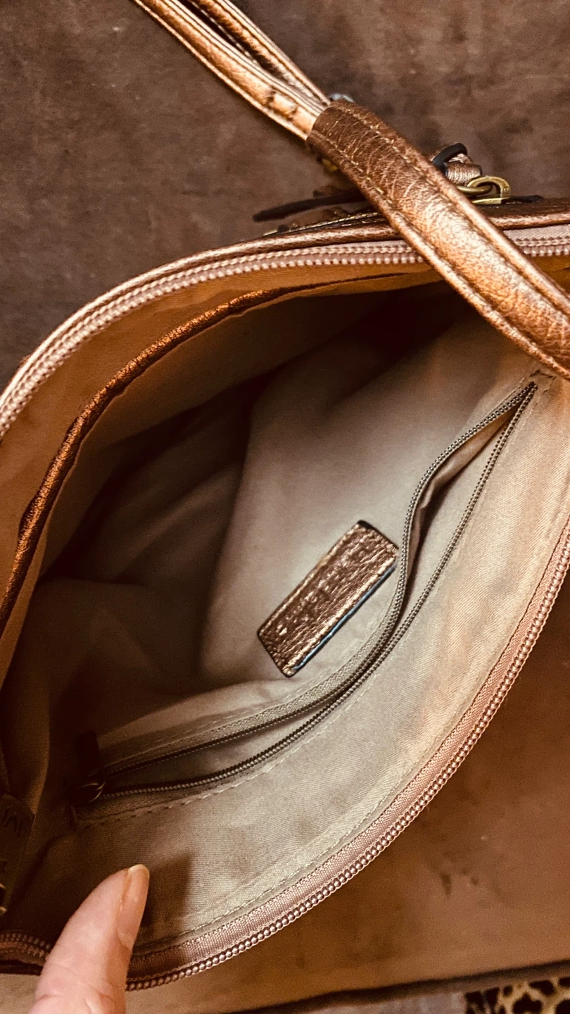 This stylish crossbody purse comes in a lovely rose gold metallic finish. It features two front pockets with buckle closures and a zippered main compartment. The adjustable strap makes it comfortable to wear.