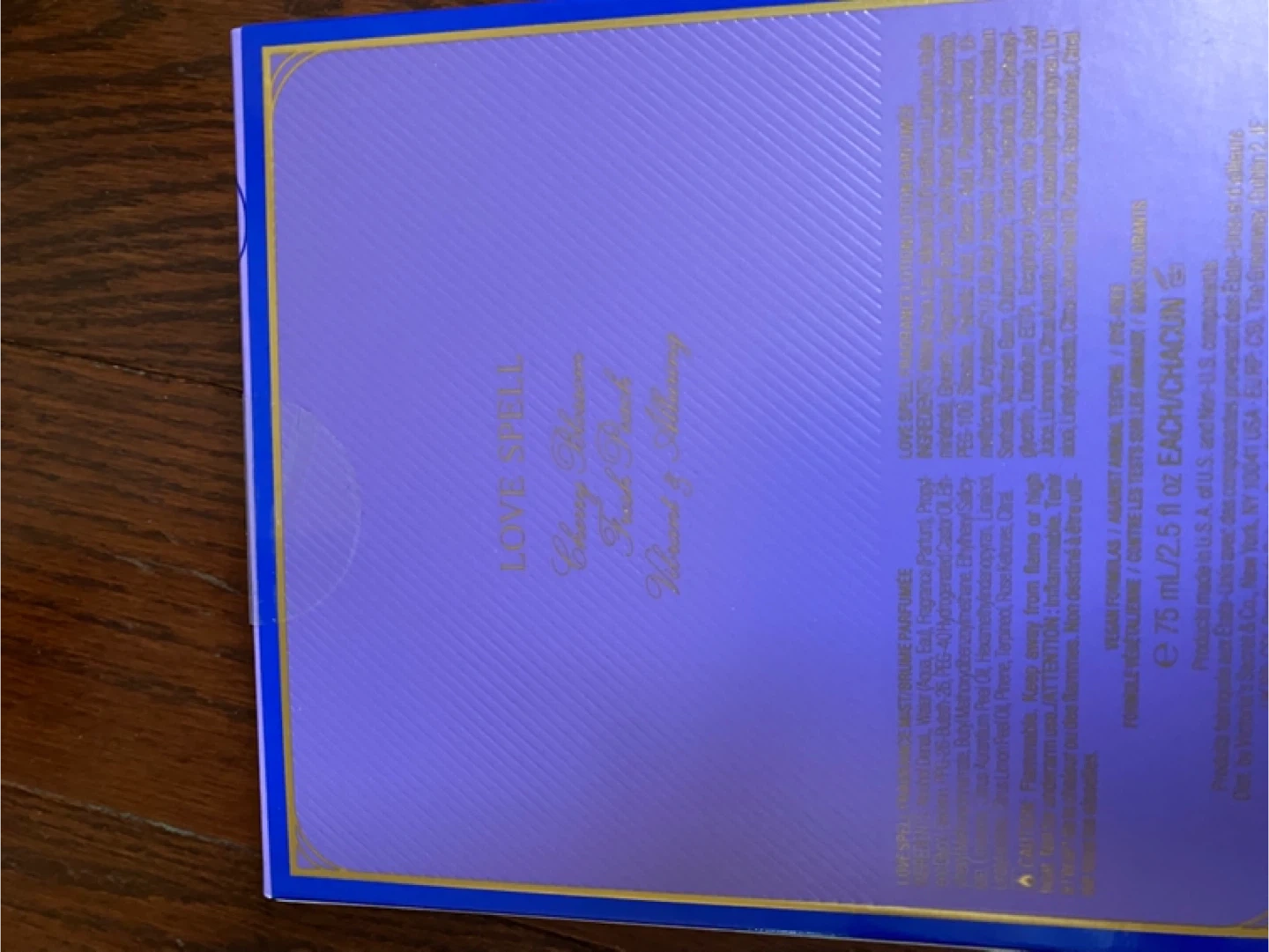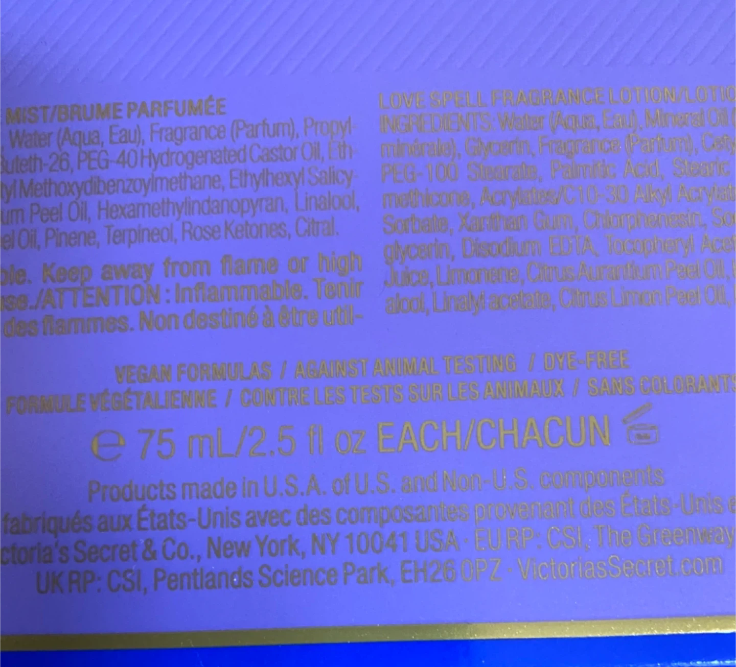 This gift set includes a Victoria's Secret Love Spell Fragrance Mist and a Fragrance Lotion. Both bottles are 75 ml / 2.5 fl oz. It's a vegan formula and is dye-free.