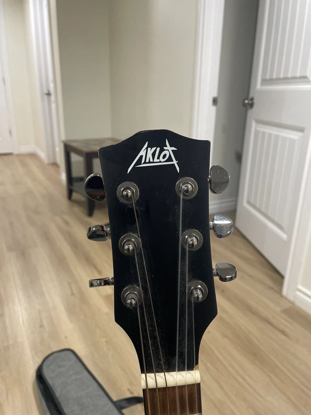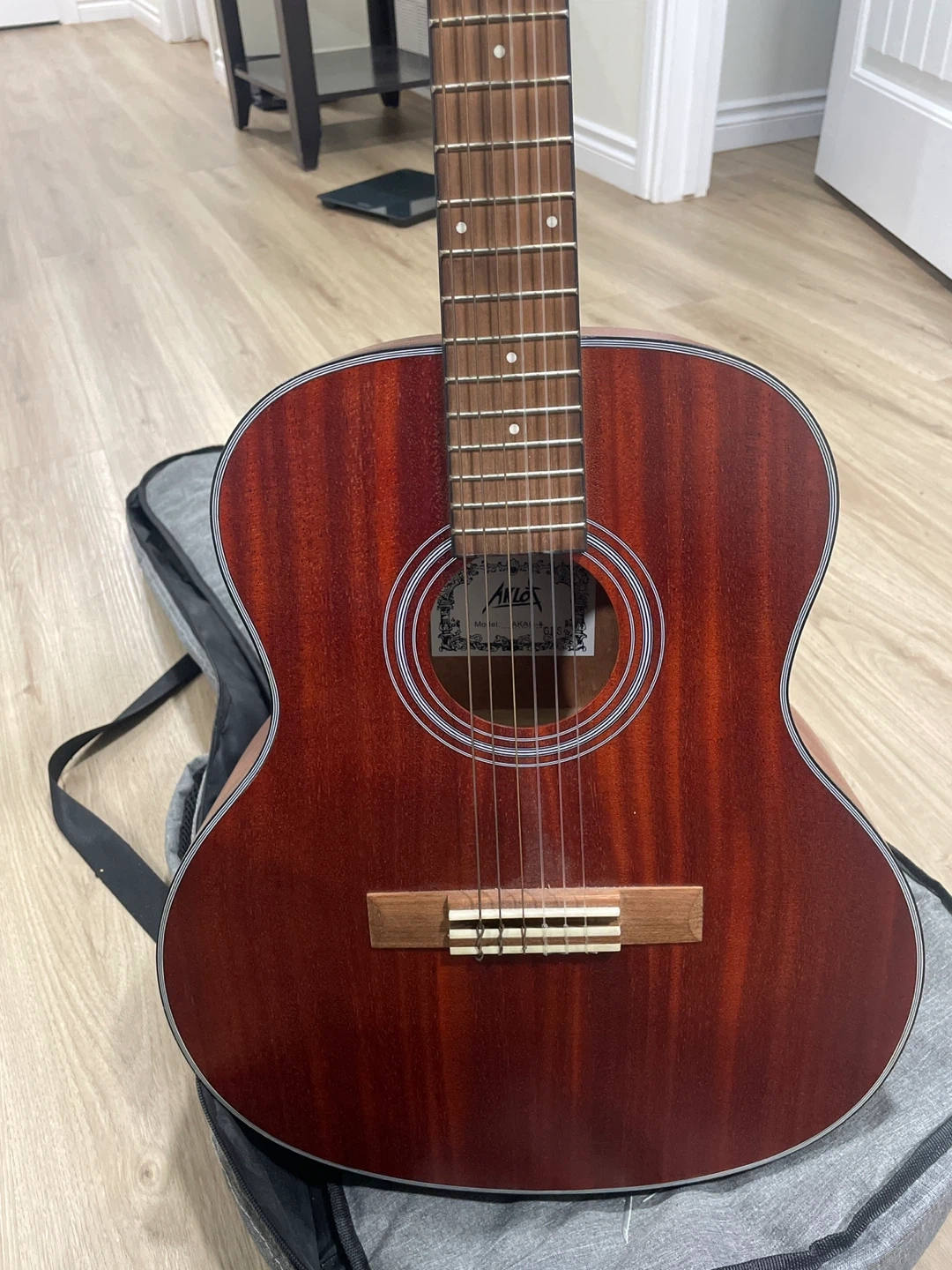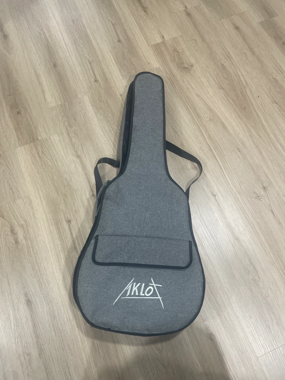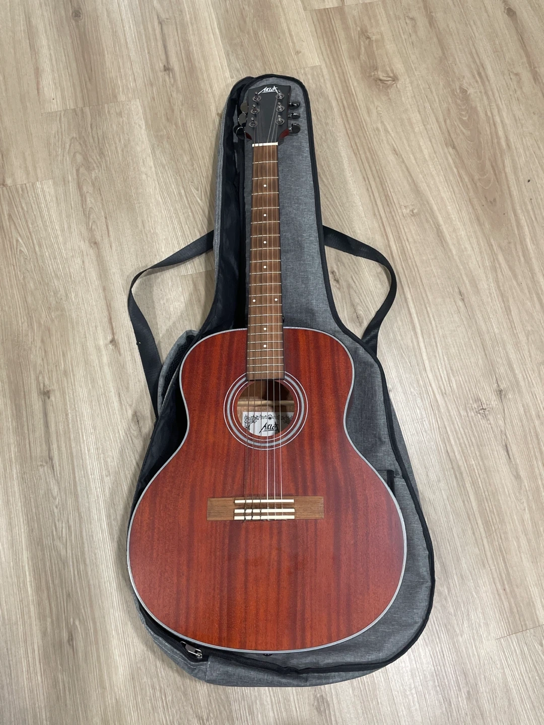 AKLOT acoustic guitar in a padded gig bag. It has a reddish-brown wood body and six strings. This guitar is suitable for beginners learning to play.