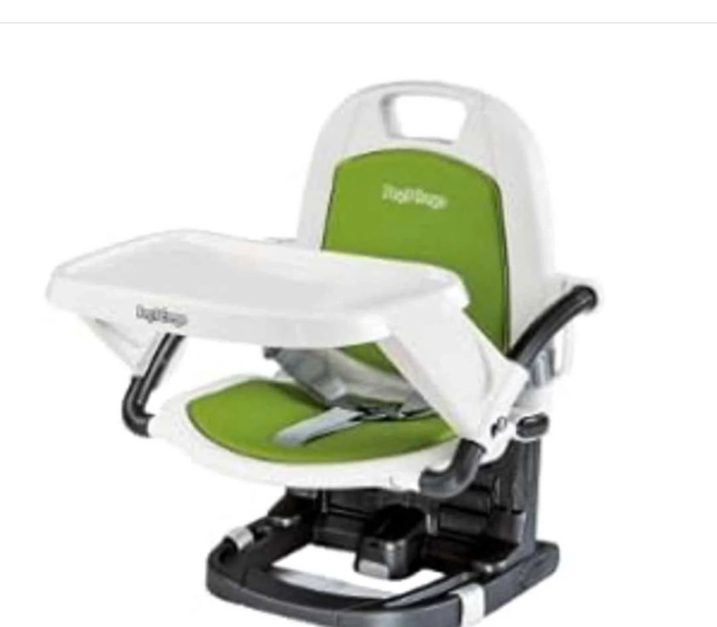 This is a Peg Perego booster seat with a tray. It has a green and white seat. This chair is suitable for feeding babies and toddlers and can be adjusted to meet a growing infant /toddler..