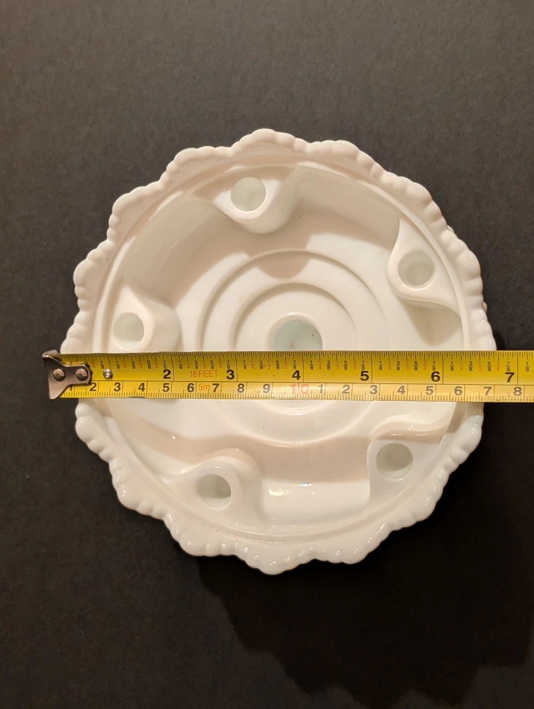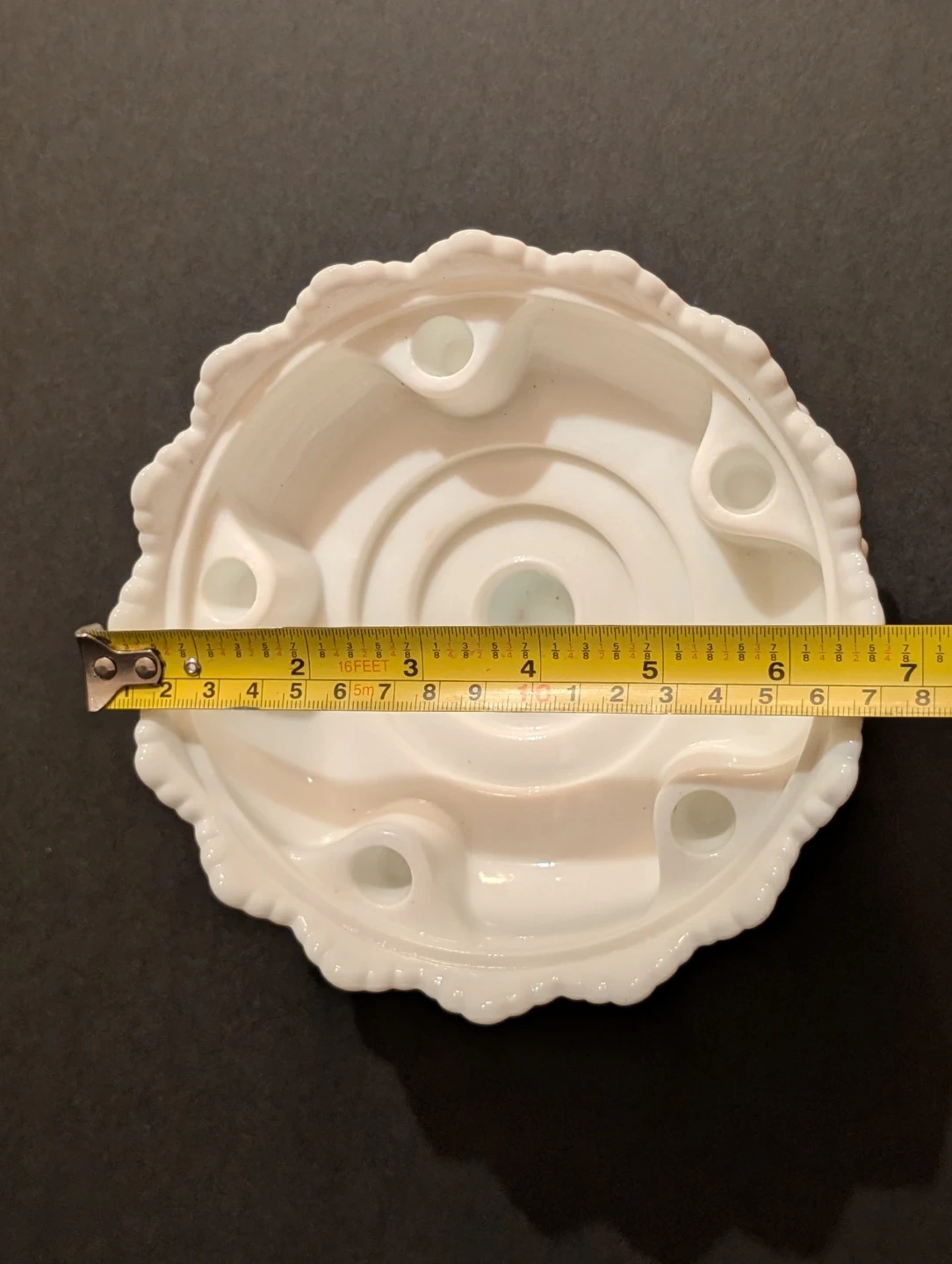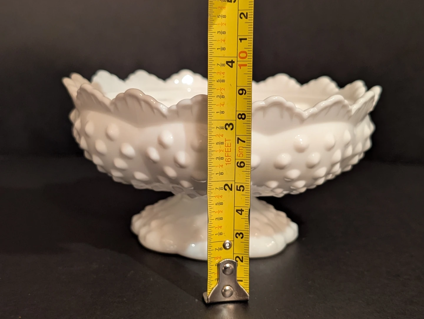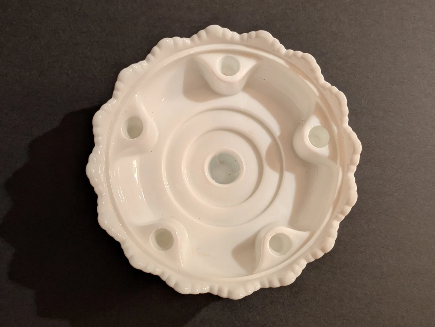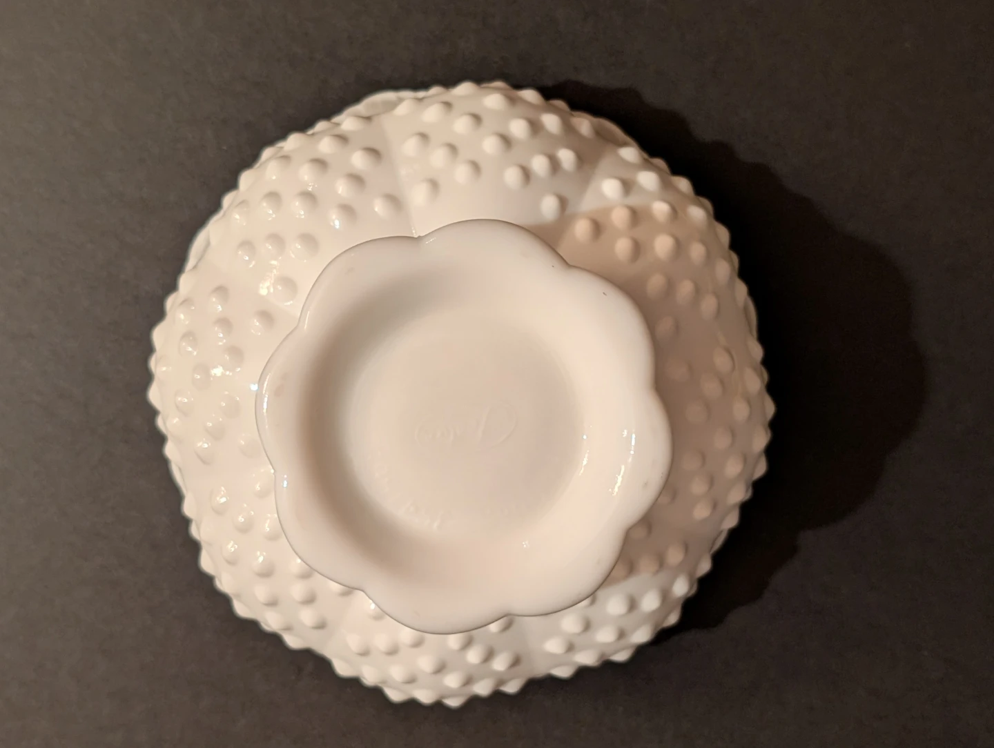 This is a vintage milk glass Fenton hobnail candleholder. It is a versatile centerpiece designed to hold five small taper candles around the perimeter and one large taper or pillar candle in the center.