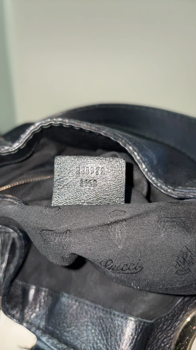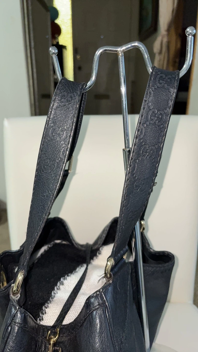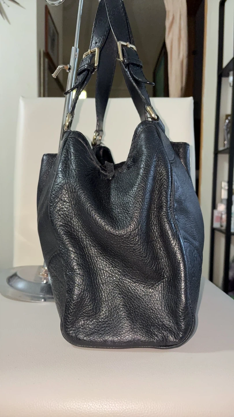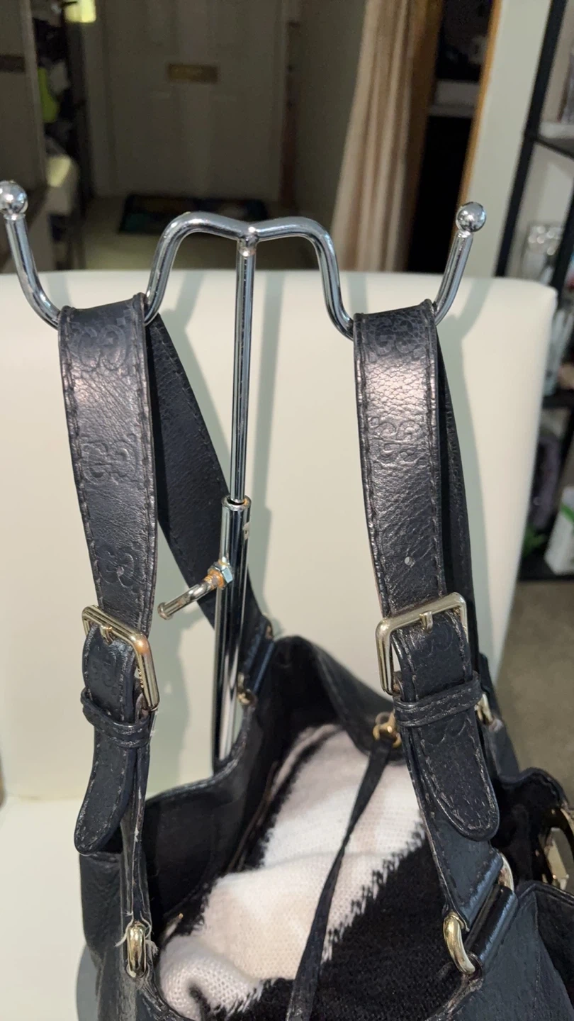Authentic Gucci black leather hobo bag with signature GG logo detailing. It's made from high-quality pebbled leather and features adjustable shoulder straps with buckle closure. Gold-tone hardware complements the classic design. Some loose threads and hardware scratches