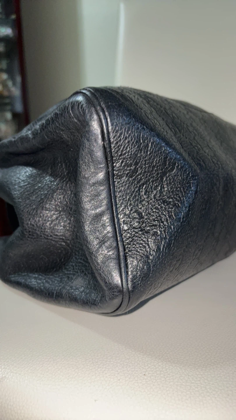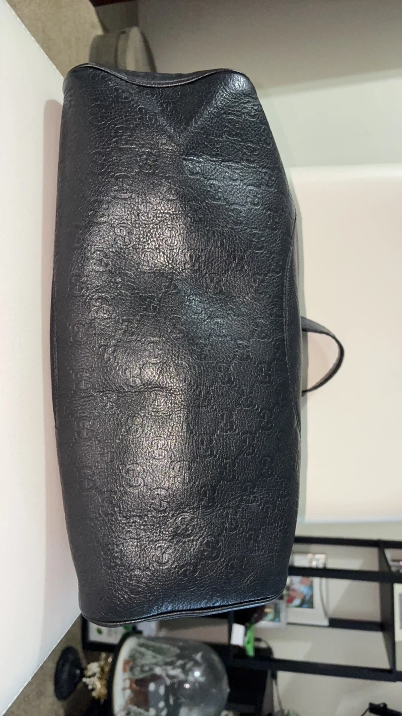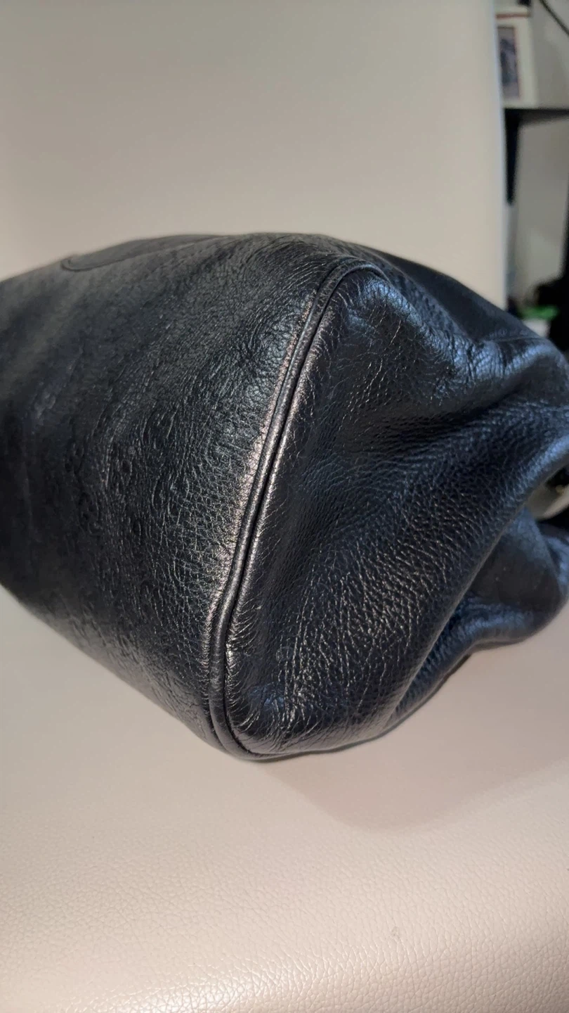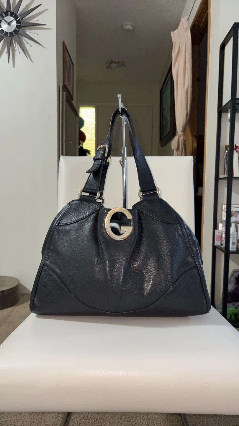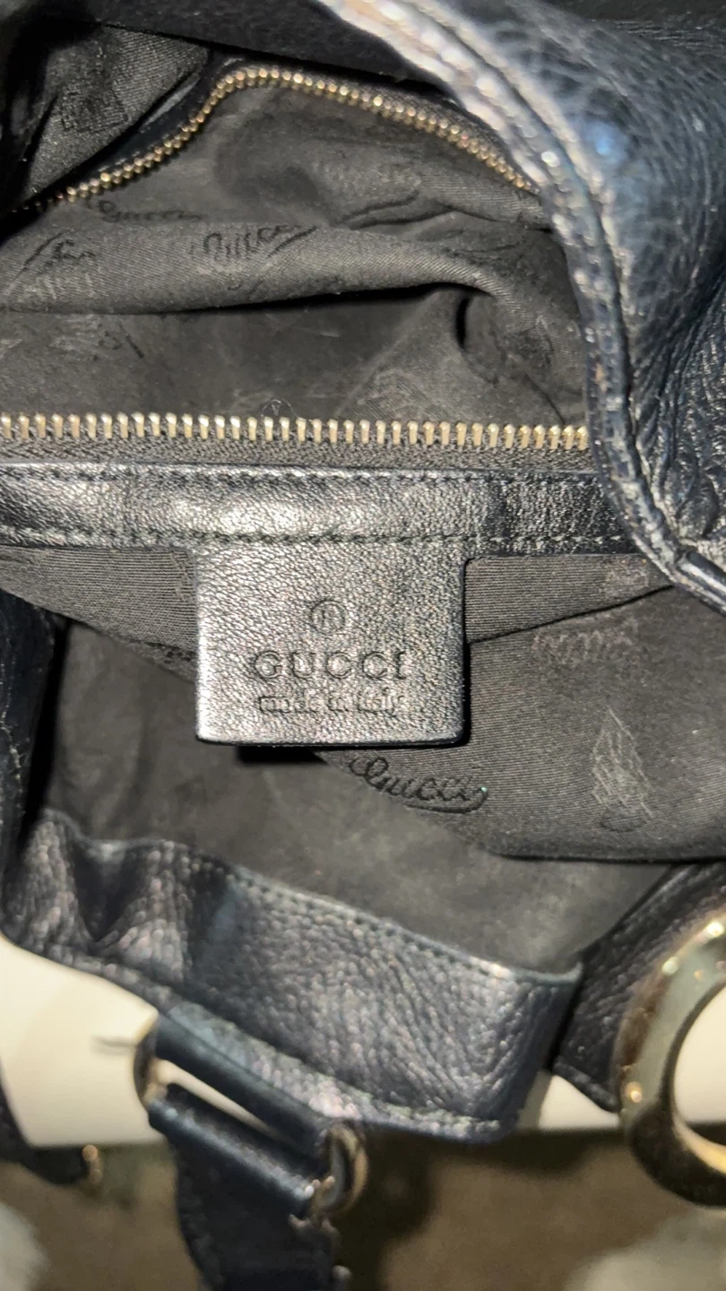 Authentic Gucci black leather hobo bag with signature GG logo detailing. It's made from high-quality pebbled leather and features adjustable shoulder straps with buckle closure. Gold-tone hardware complements the classic design. Some loose threads and hardware scratches
