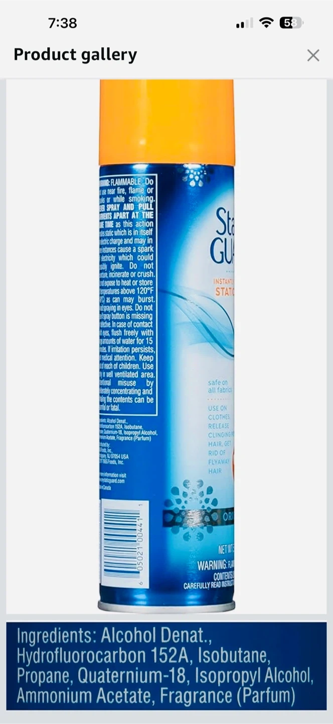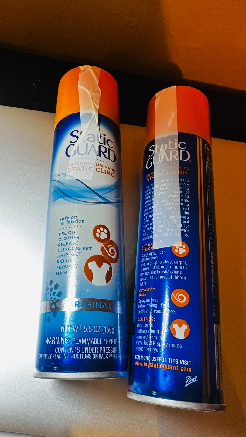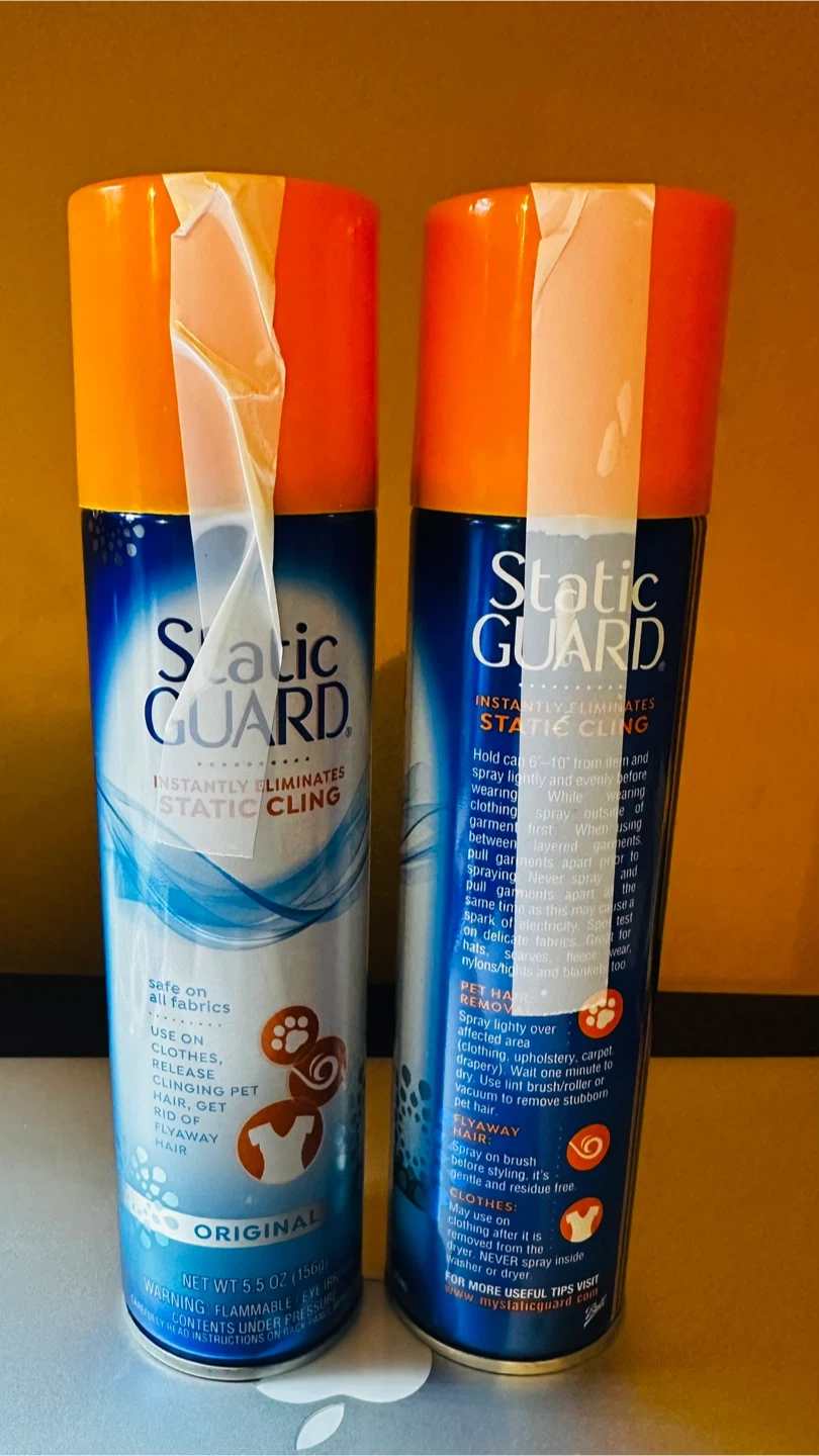 This is a 2-pack of Static Guard spray that instantly eliminates static cling. It's safe on all fabrics and can be used on clothes, releasing clinging pet hair, and flyaway hair. Each can contains 5.5 oz (156g) of product.