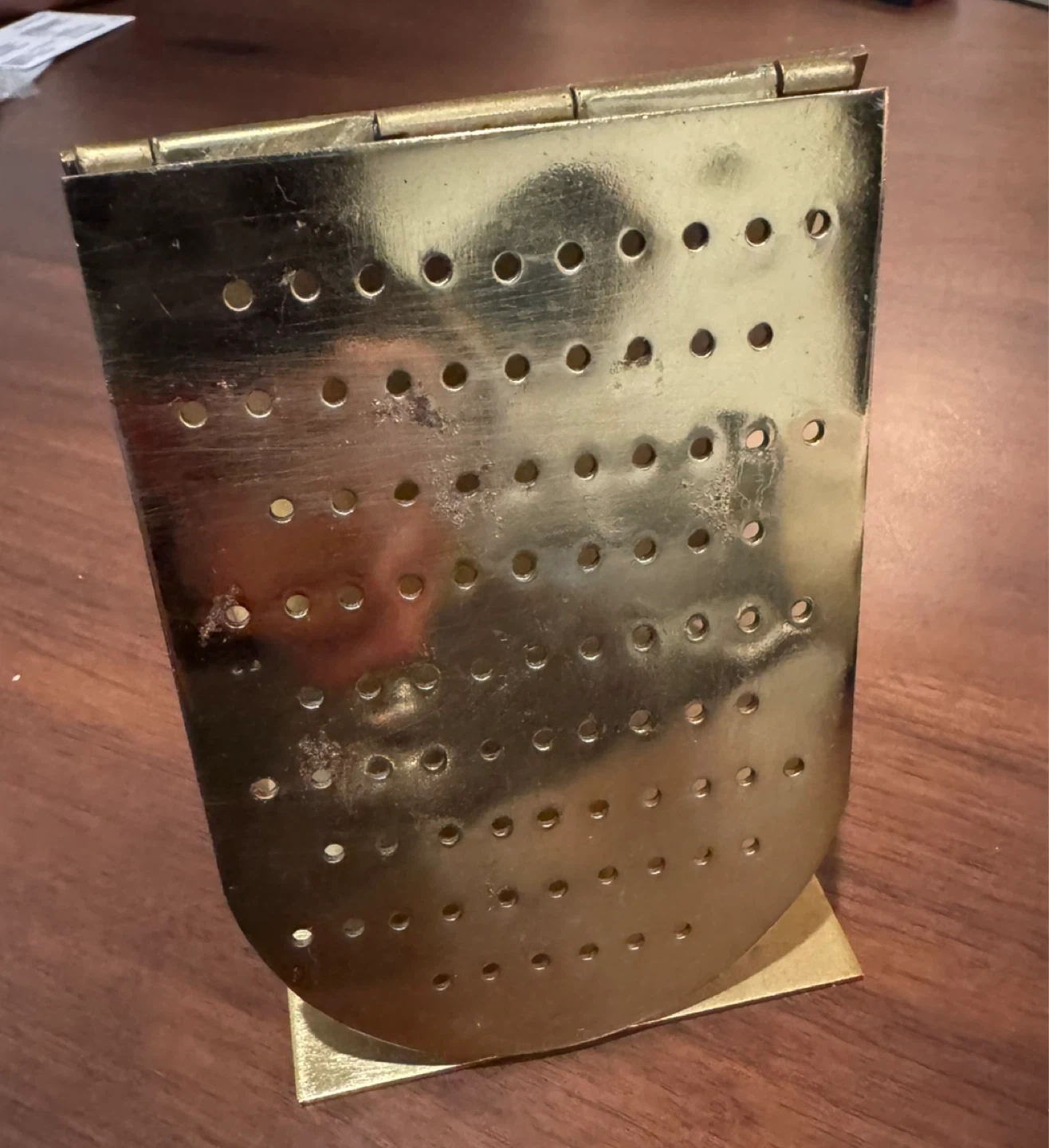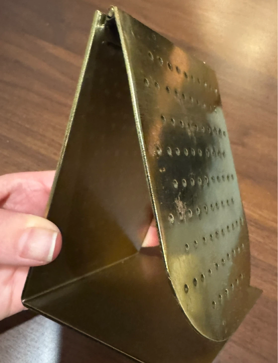 This is a brass jewelry holder stand with many holes for earrings or other small items. It's a foldable design for easy storage. Holds lots of earrings!