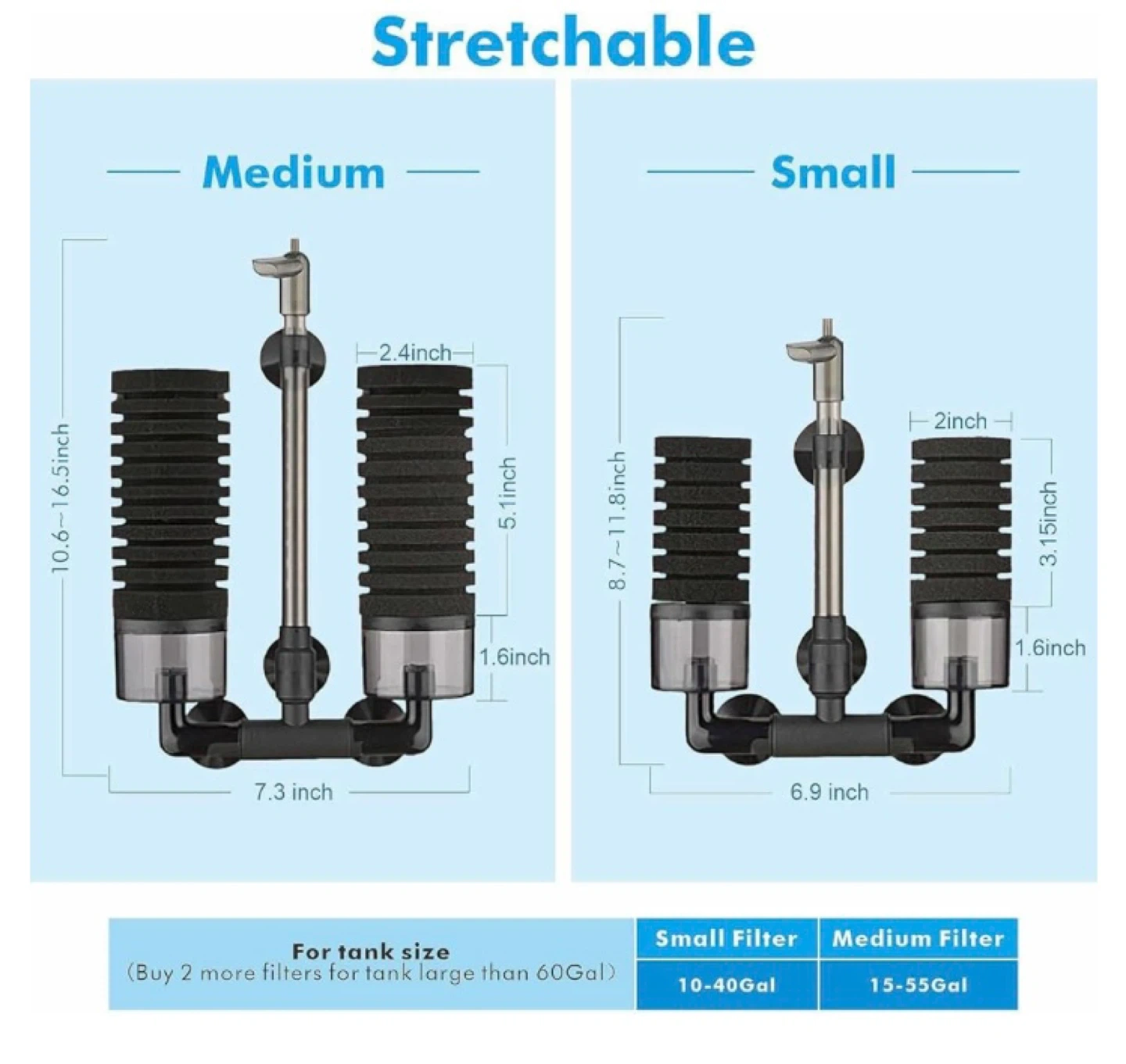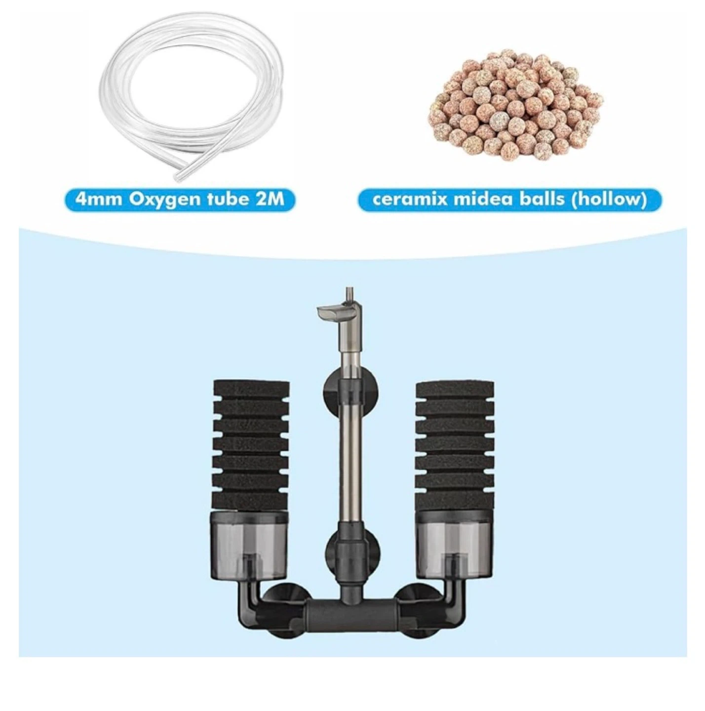 This double sponge filter is designed for 10-20 gallon fish tanks. It includes ceramic media balls and 2 spare sponges. The filter comes with a 1.5M tube. It's an air sponge filter and requires an air pump (not included). New Cash only
