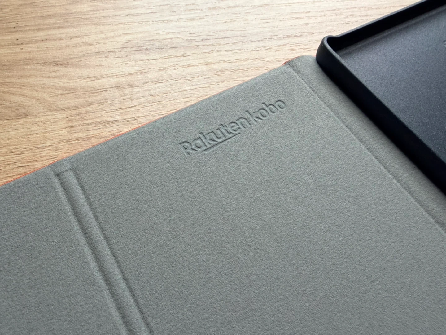 This is a red folio case for your Rakuten Kobo e-reader. It has a soft grey interior lining and a secure black holder. It offers protection for your device.
