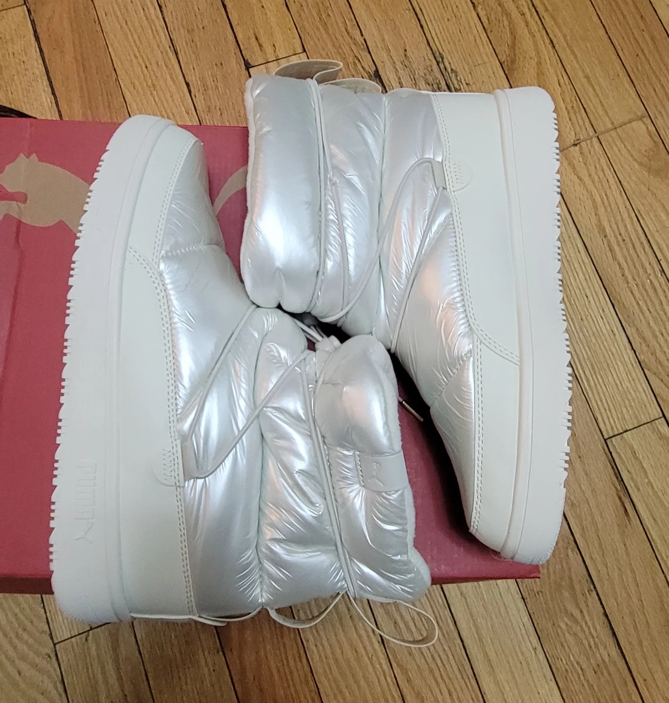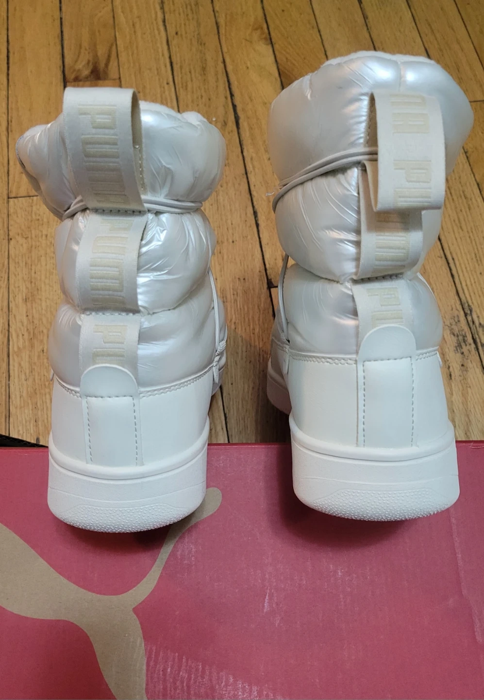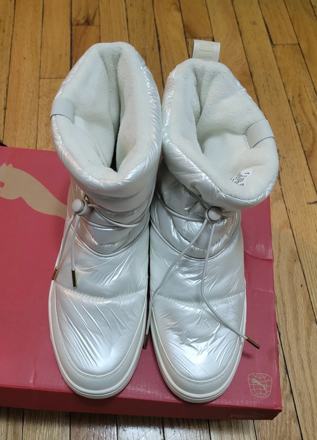 Puma women's puffer snow boots in a pearly white color. These boots feature a drawstring closure and cozy faux fur lining. They come with the original box.