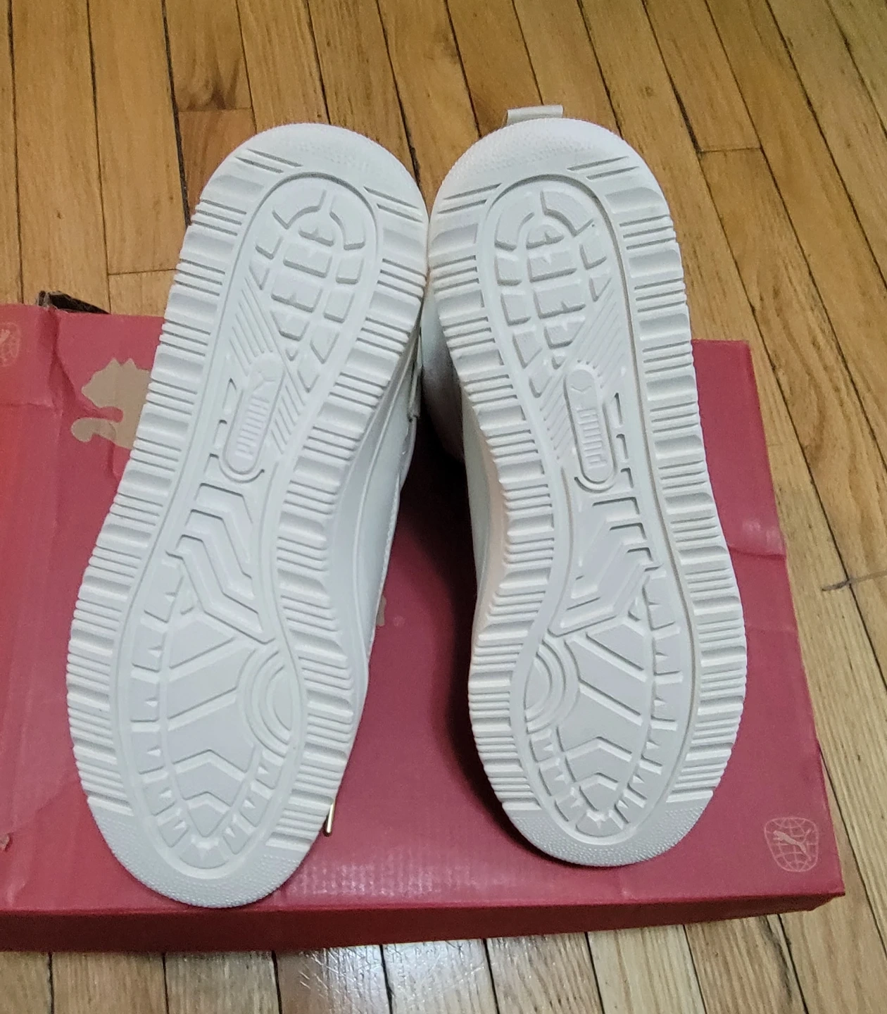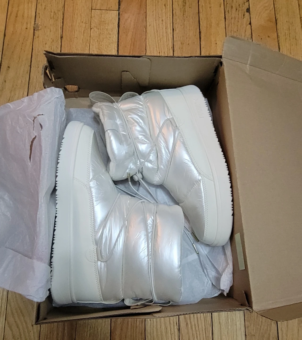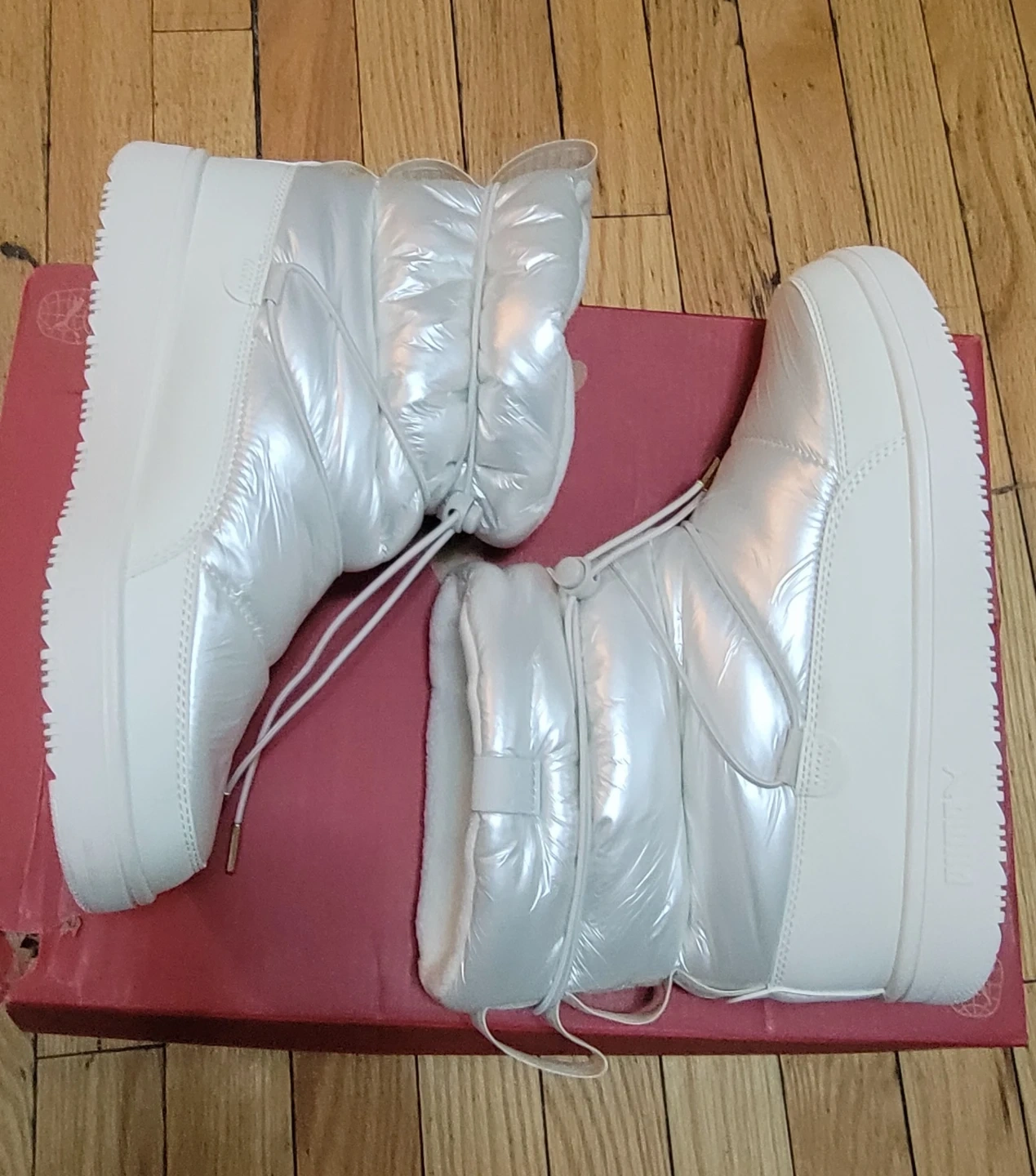 Puma women's puffer snow boots in a pearly white color. These boots feature a drawstring closure and cozy faux fur lining. They come with the original box.