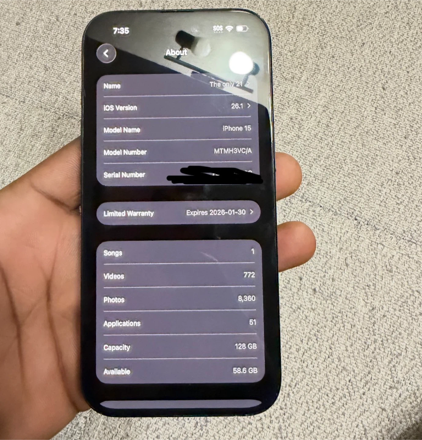 This is an Apple iPhone 15 with 128 GB of storage. The iOS version is 26.1. It comes with a limited warranty that expires on 2026-01-30. It has a little dent but apart from that it’s working perfectly
