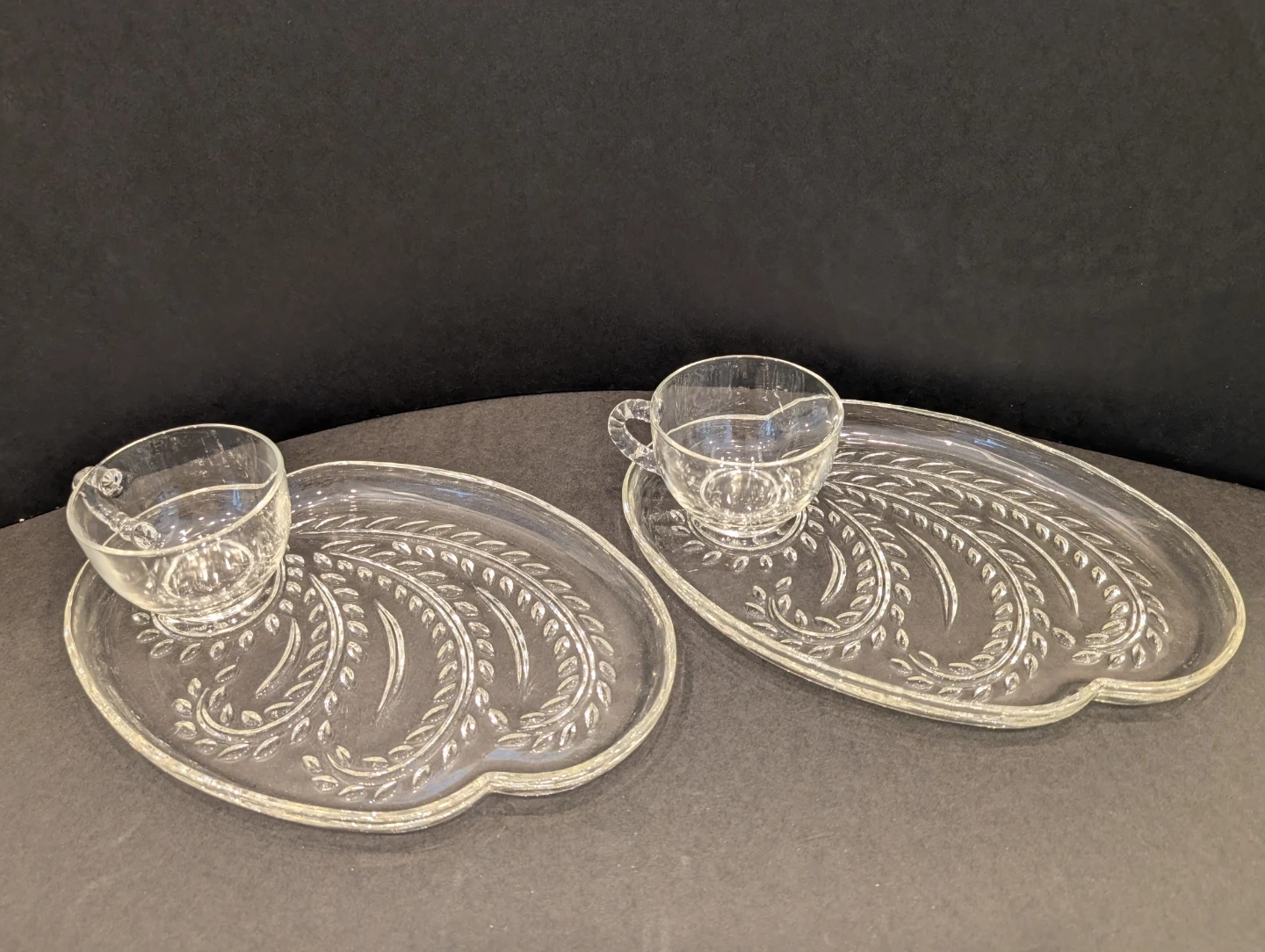 Set of two Federal Glass Homestead snack sets. Featuring an embossed grain stalk/wheat pattern. Perfect vintage addition for tea and dessert time. In great condition!