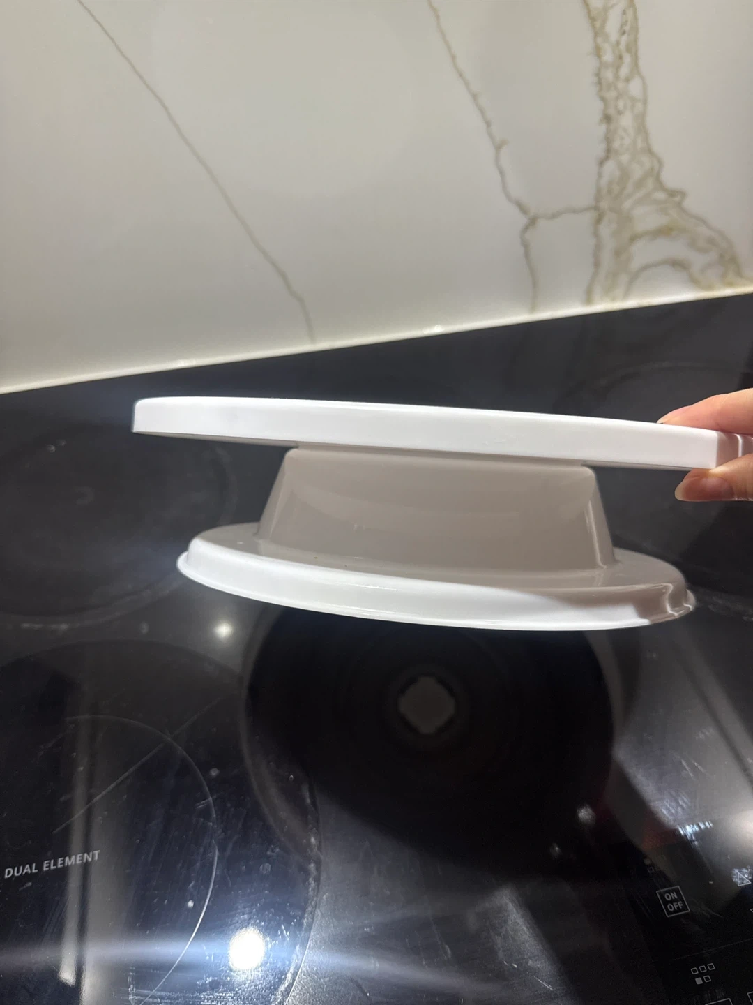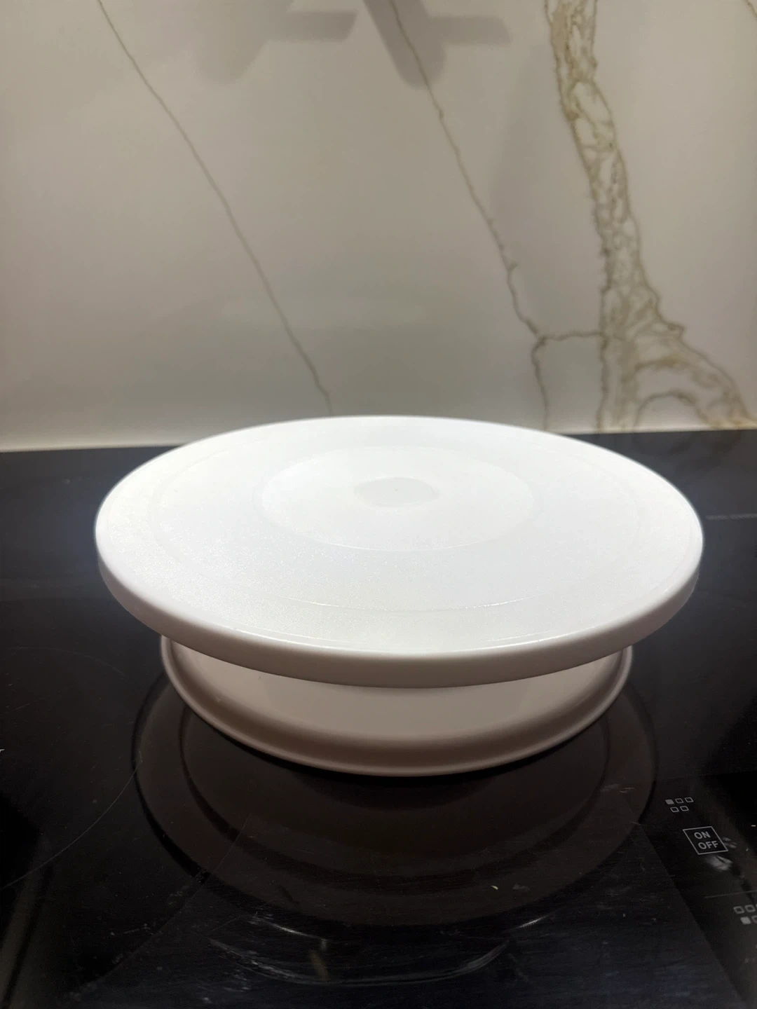 This is a white cake decorating turntable. It's made of plastic and spins smoothly. Useful for decorating cakes and pastries!