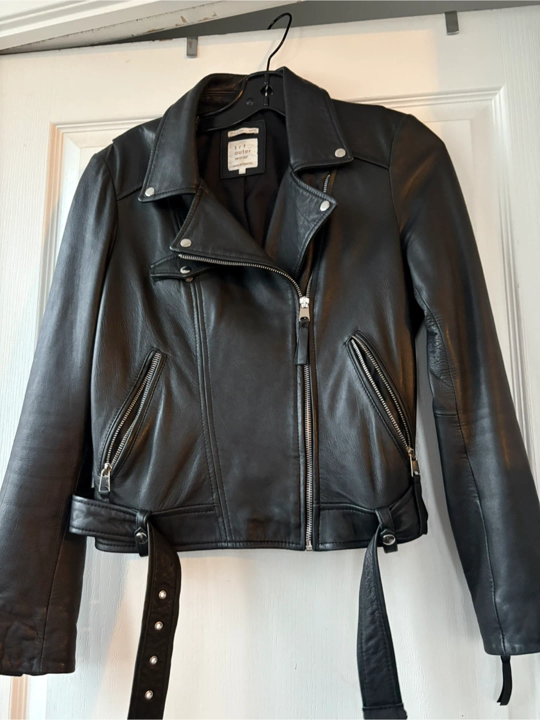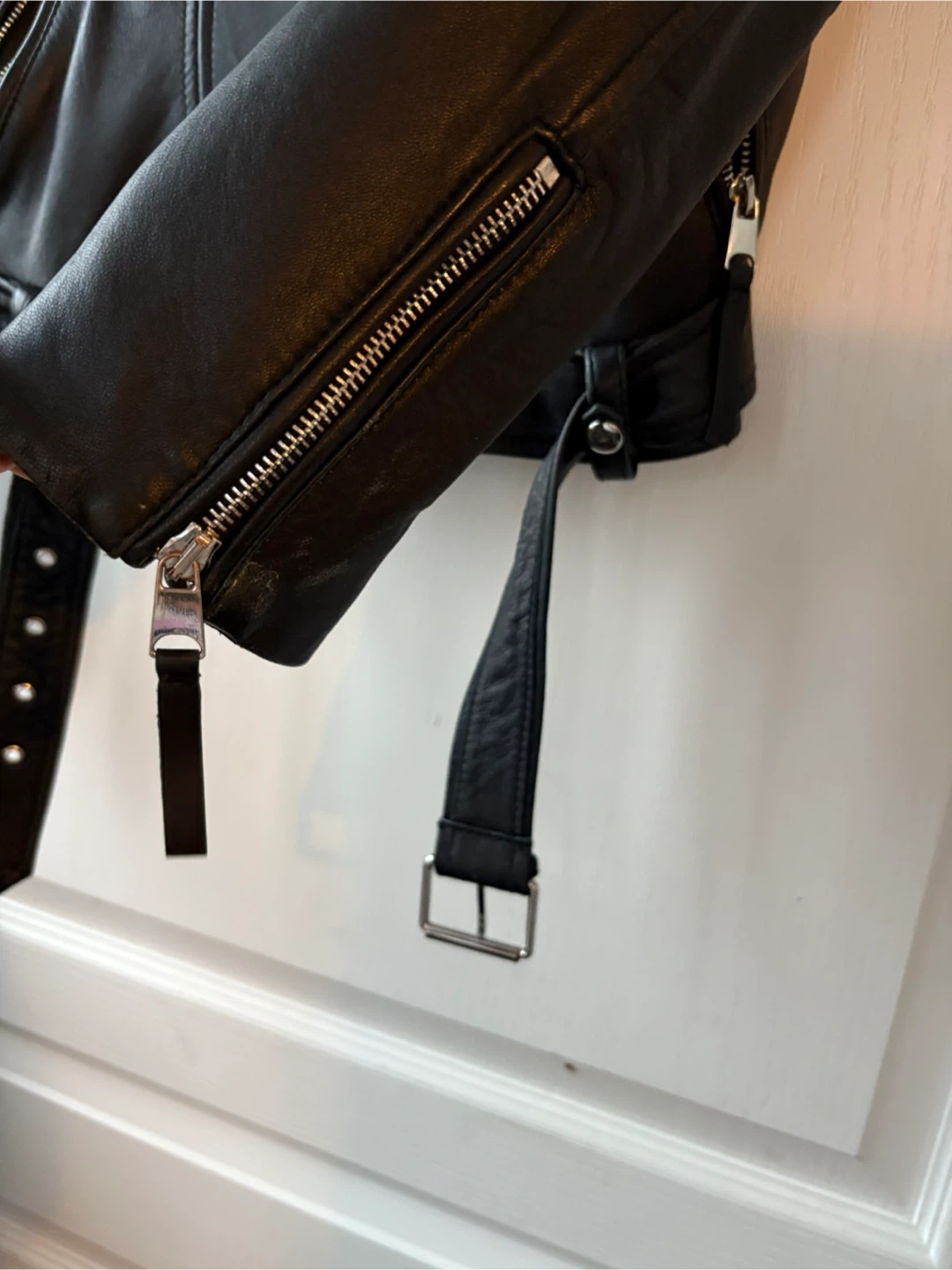 Classic black faux leather moto jacket from Zara TRF. It's got a timeless design with zippers and a belt detail. This jacket adds instant cool to any outfit!