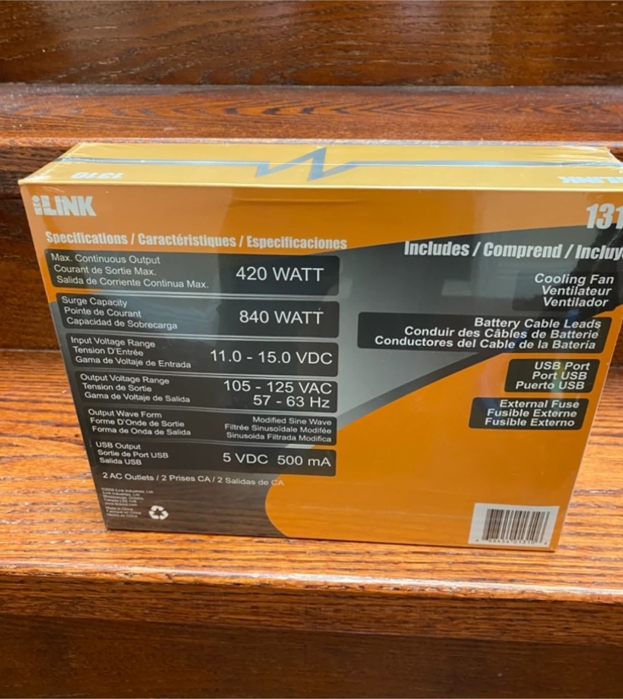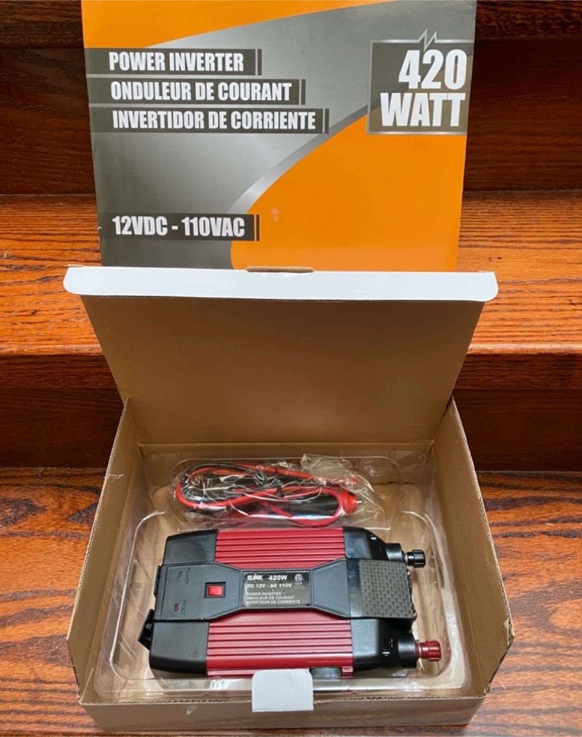 This iLINK 420W power inverter converts DC 12V to AC 110V. It features a cooling fan and a USB port for charging devices. Battery cable leads and an external fuse are included.