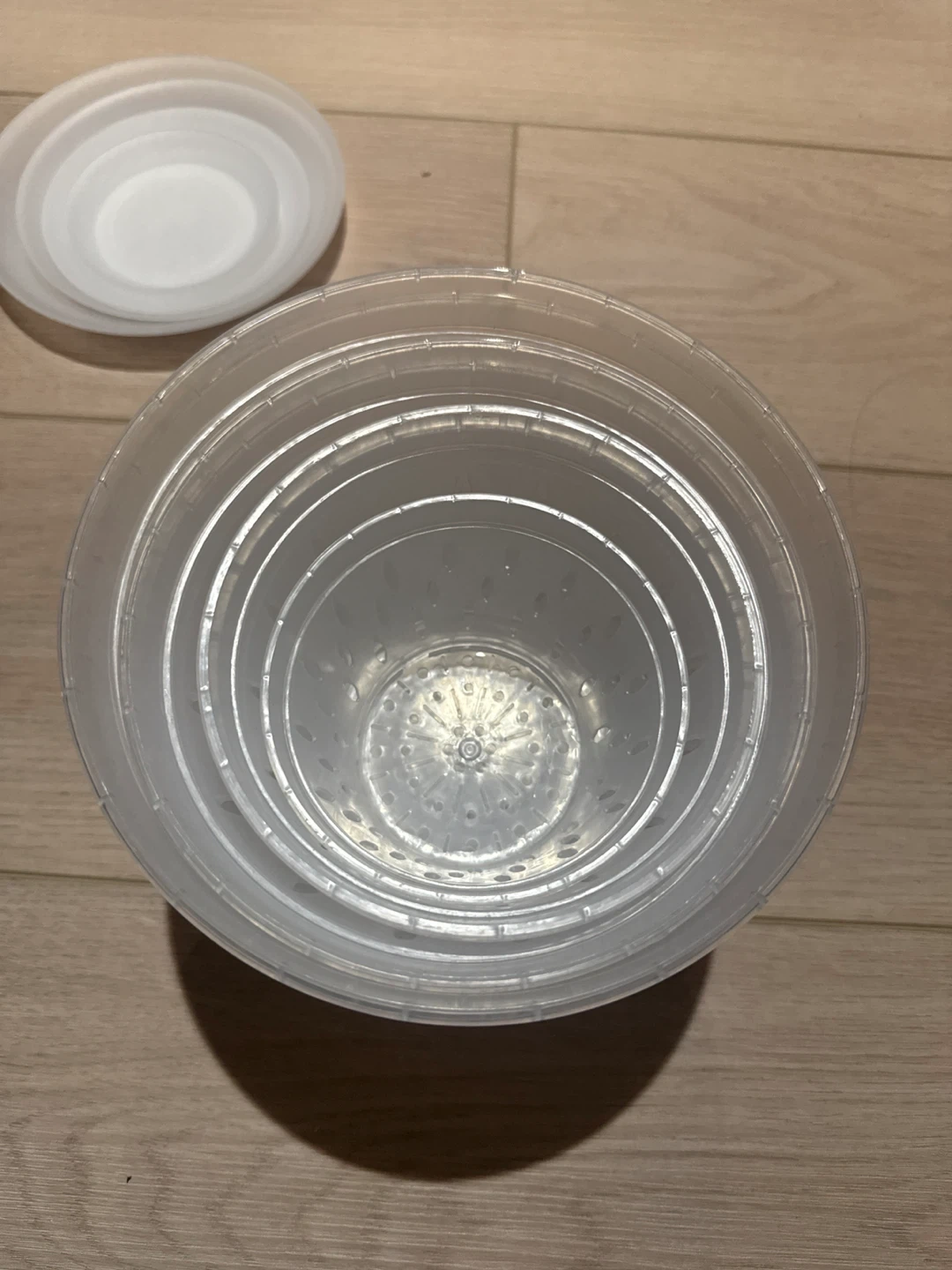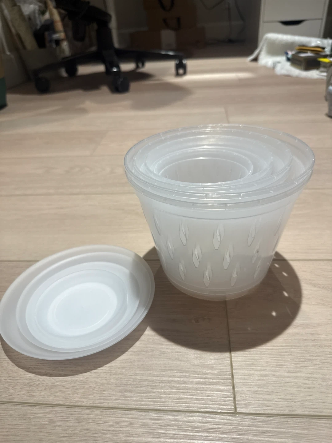 This set includes clear plastic plant pots with drainage holes and matching saucers. They're stackable for easy storage. Great for starting seedlings or small plants! 7 plants and 5 saucers in total. Brand new never used before