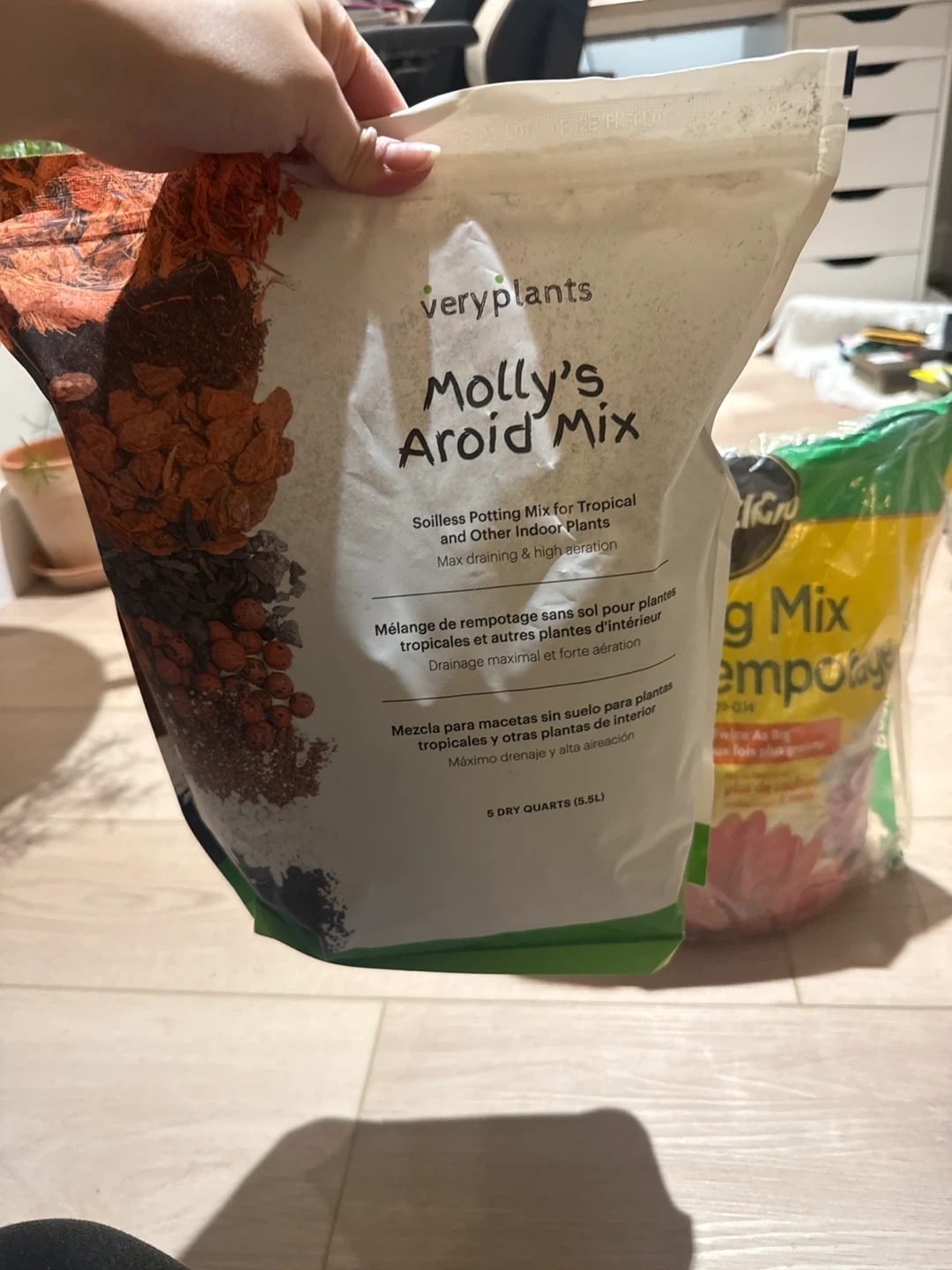 Soilless potting mix for tropical and indoor plants. It's designed for max drainage and high aeration. Contains 5 dry quarts (5.5L).