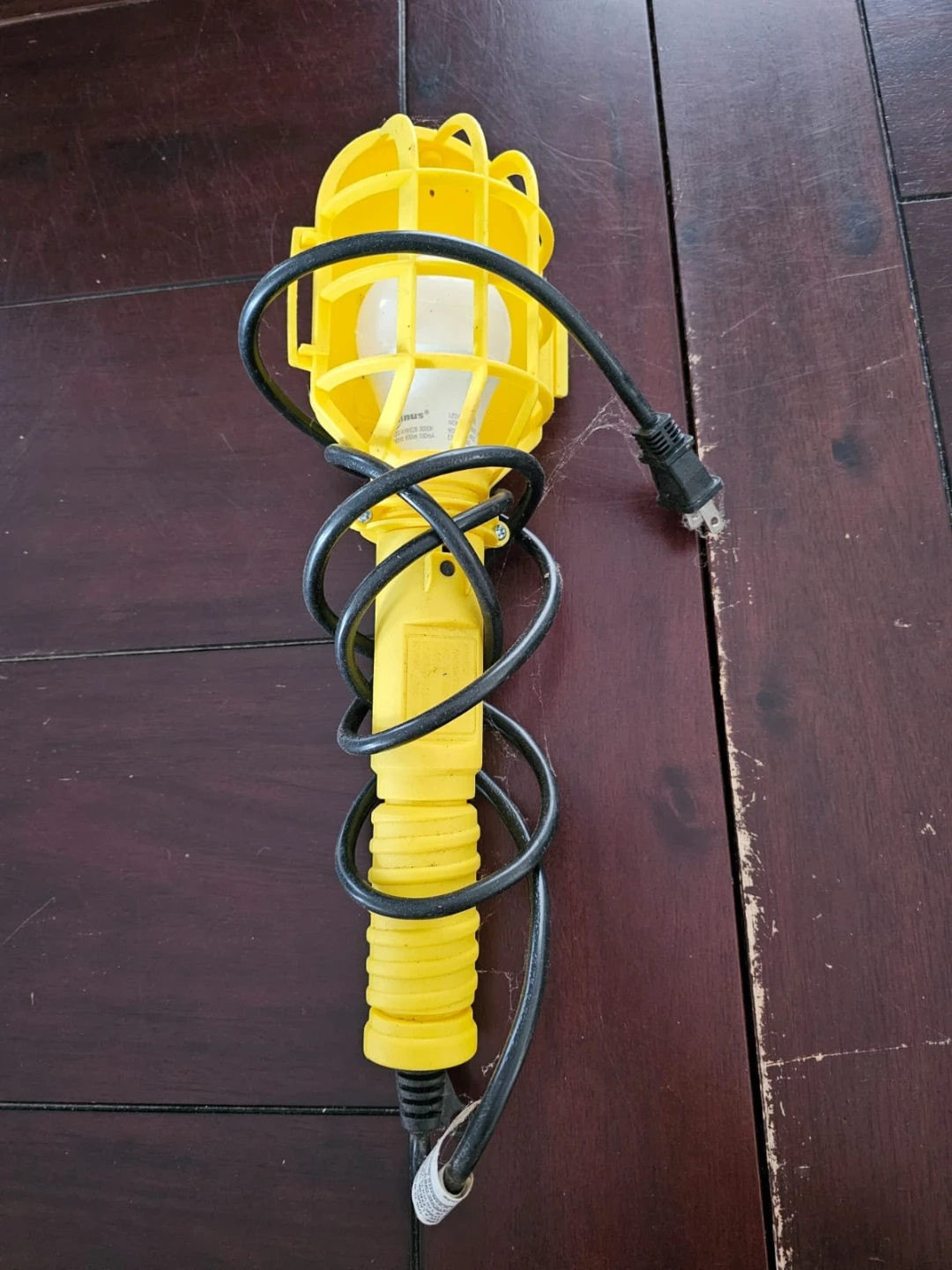 This is a durable yellow work light, built to withstand tough job sites. It features a sturdy protective cage around the bulb. The cord is a generous length for flexible placement. This light is ideal for workshops, basements, or any area needing reliable illumination.