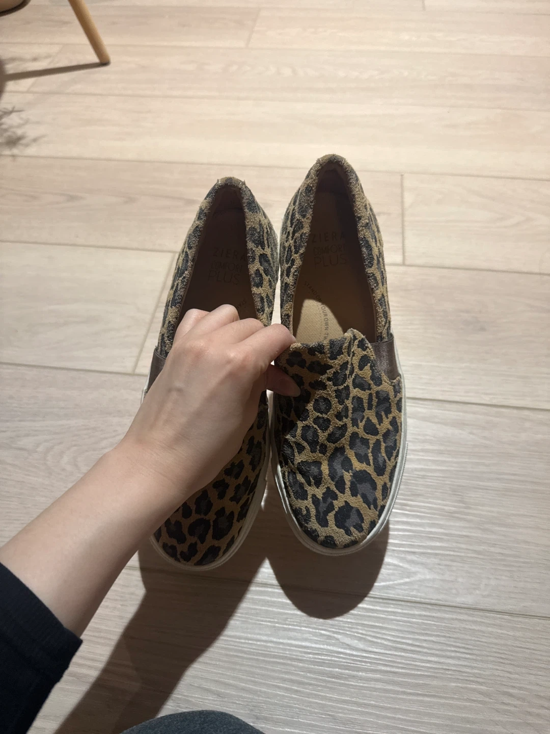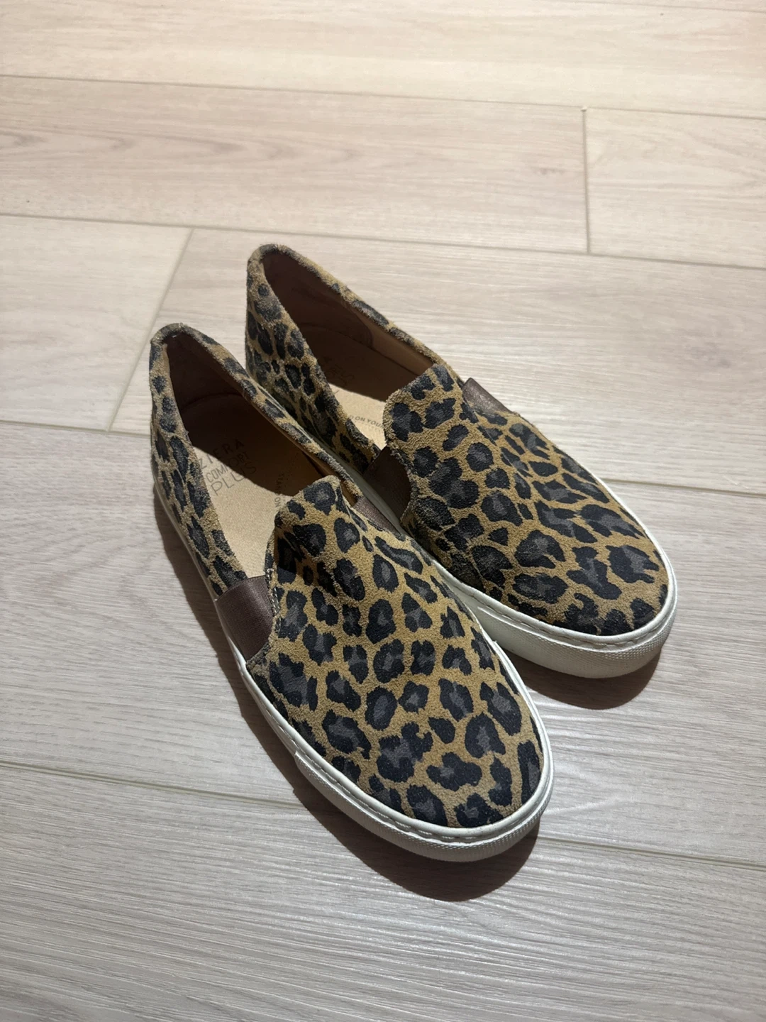 Comfort Plus slip-on shoes with a stylish leopard print. Features a cushioned insole and flexible sole. Great for casual everyday wear!